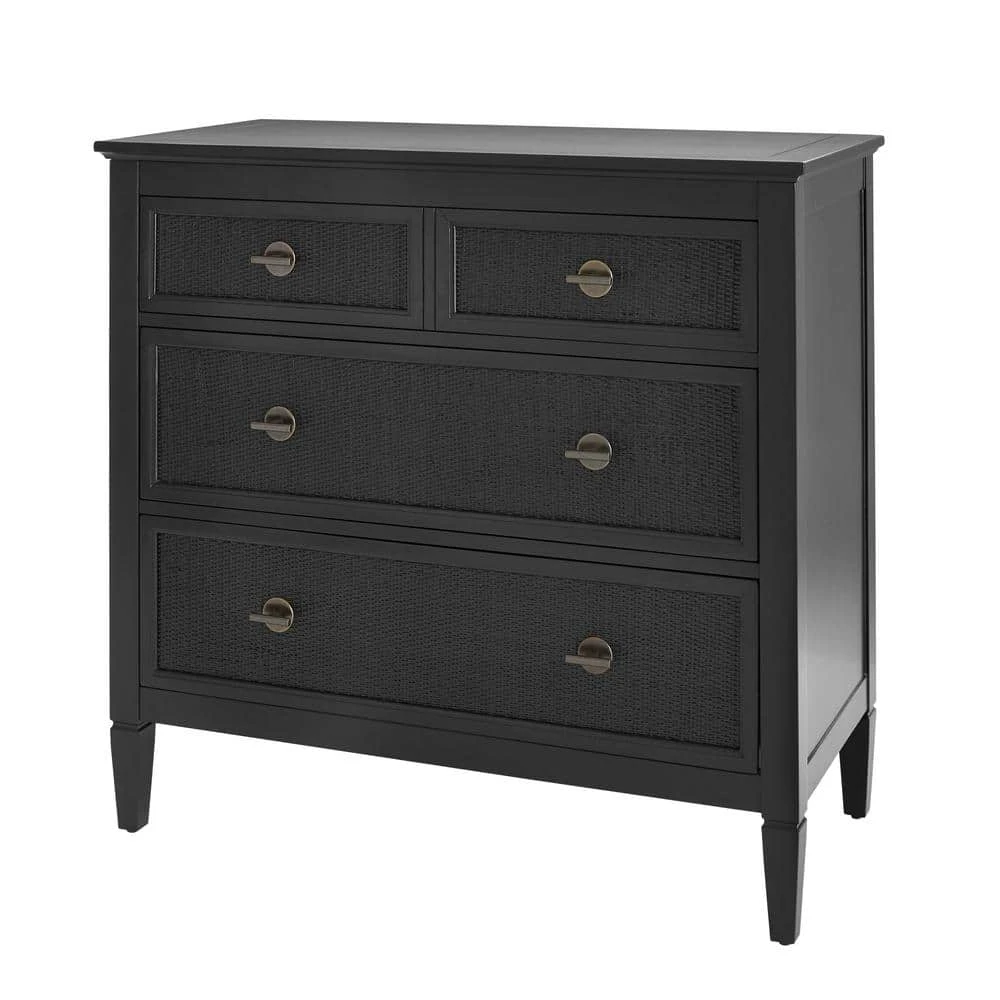 The Marsden 3-Drawer Wooden Cane Chest of Drawers in black is the perfect modern addition to your bedroom. This chest features a total of three stacked drawers accented with woven rattan cane fronts for the perfect organic, textural contrast to your space. Constructed with a simple wooden frame in a black finish and classic oil-rubbed bronze hardware, this dresser brings a light, airy feel to your space that easily adapts to a modern transitional or contemporary farmhouse style. Standing at 38″ W x 36″ H, the Marsden 3-Drawer Chest of Drawers is the perfect storage option for any size area, especially small spaces. The Marsden 3-Drawer Chest of Drawers is exclusively offered by the Home Decorators Collection and comes in ivory, black, and patina wood finishes. For a full bedroom refresh with a relaxed modern flare, be sure to check out the coordinating bed, nightstand, and dresser offered in the full Marsden Cane Collection.