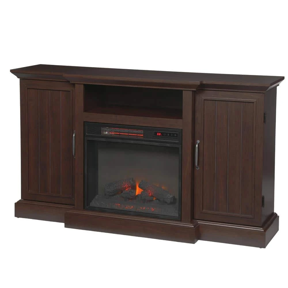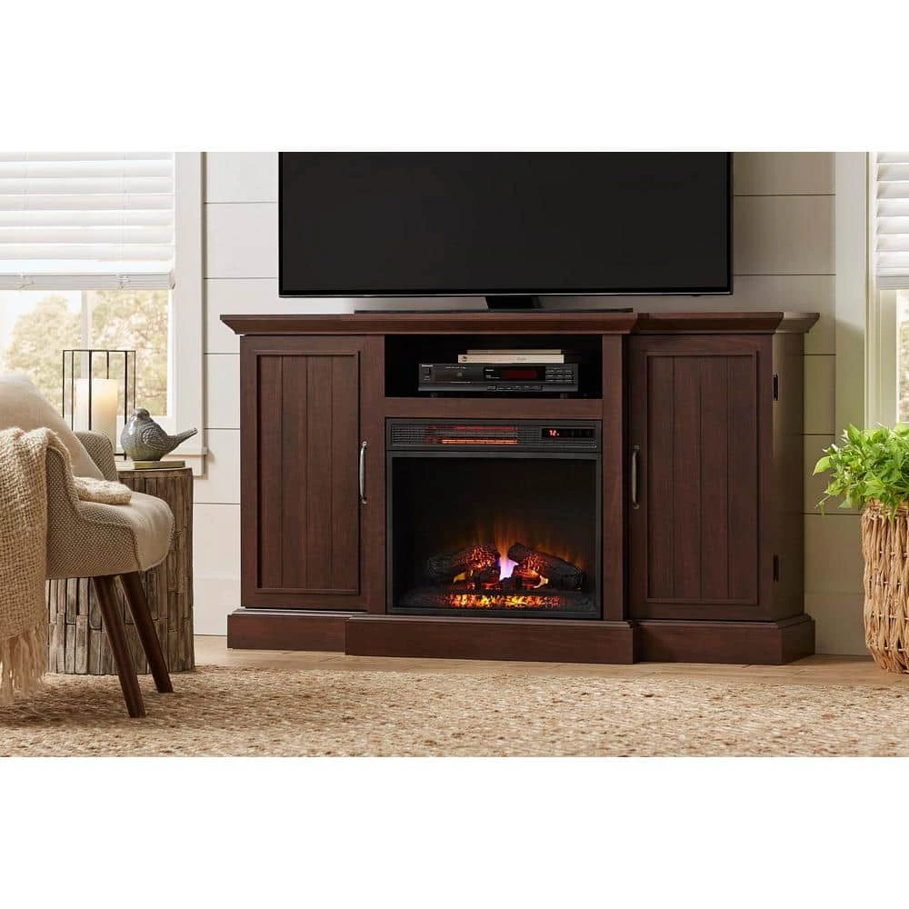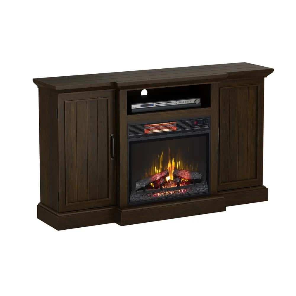 Rustic charm meets warm, inviting ambiance in this TV stand with a screen-front, infrared quartz electric fireplace. With supplemental zone heating for up to 1,000 sq. ft., this 5,200 BTU electric fireplace lets you turn down your thermostat and heat up the room you’re using. The infrared quartz heat maintains the natural humidity in the air for comfortable heat without drying out the air. Accommodating most flat screen TVs up to 65 in. and up to 90 lbs., this TV stand also includes a center media shelf and two concealed side cabinets with adjustable shelves. A Midnight Cherry finish, breakfront profile, plank detail and Antique Black hardware adorn this TV stand. Patent-pending Safer Plug fire prevention technology relentlessly monitors the temperature of the plug and can automatically shut off the unit if needed, giving you a peace of mind. Choose between three blue or three amber brightness options with the Spectra fire flame effect technology to create the perfect ambience. Use this function with or without the heater to enjoy a rolling fire all year long.