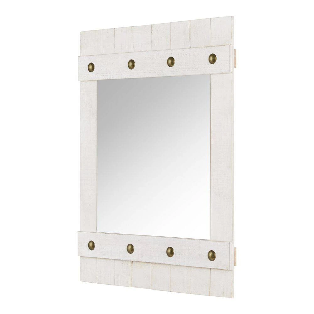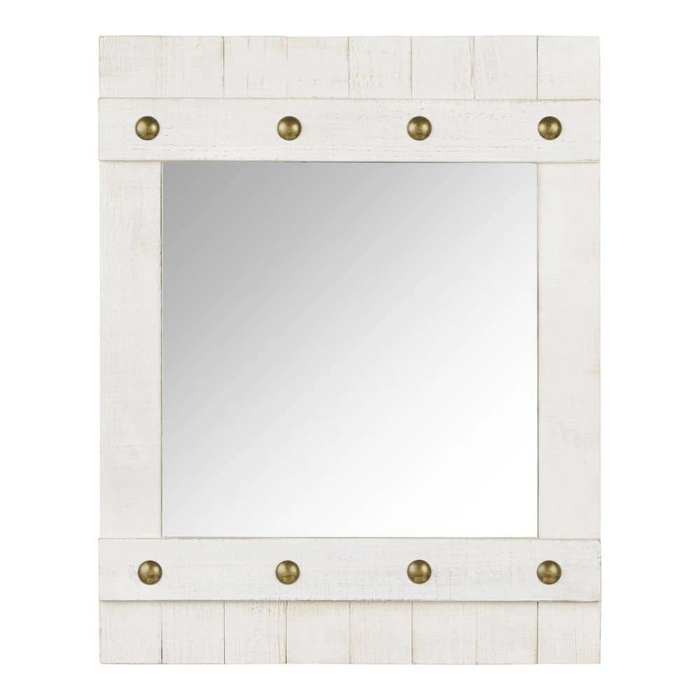 Enhance your decor with this Home Decorators Collection Medium Brass Studded White Wooden Shiplap Mirror. The rectangular shape and a shiplap design transform your bare wall space, while the wooden frame provides strength and added stability. Support for both vertical and horizontal orientations gives you the freedom to decorate, and the white finish complements your interior color scheme. This accent mirror offers a farmhouse or coastal feel to your entry, living space, or bedroom for versatility.