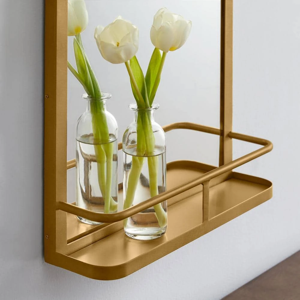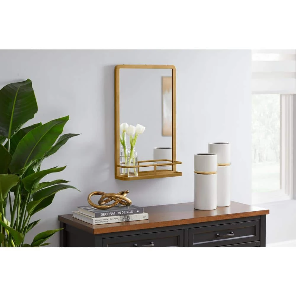 Create a sense of space in your living room or bedroom with this Home Decorators Collection Modern Rectangular Gold Framed Mirror. The rectangular iron frame helps keep the mirror in place, while the included shelf accommodates your keys and other small items. A vertical orientation spruces up your bare wall, and the gold finish lends the design an attractive accent. This Home Decorators Collection contemporary decorative wall mirror features metal keyhole hangers behind the frame for hassle-free mounting.