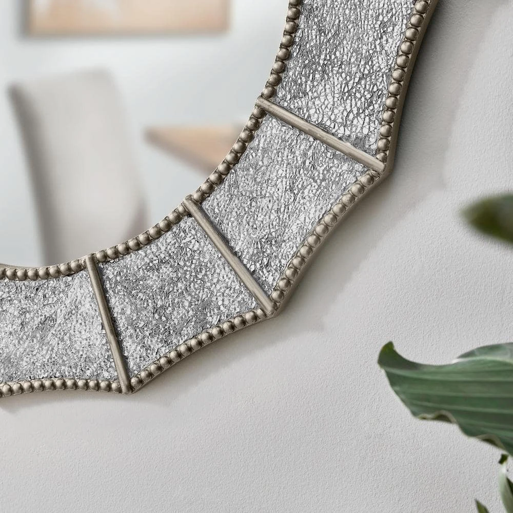 Elevate your home space with the Home Decorators Collection Medium Round Silver Antiqued Glam Accent Mirror. It features a glass frame with a silver finish that adds a glamorous touch to your vintage-style decor. It comes pre-installed with D-rings on the back for easy hanging and secure placement of the round mirror. You can wipe its surface with a standard glass cleaner and a soft cloth for easy maintenance. With its attractive design, this mirror makes for an ideal addition to your living room, bedroom, or den.
