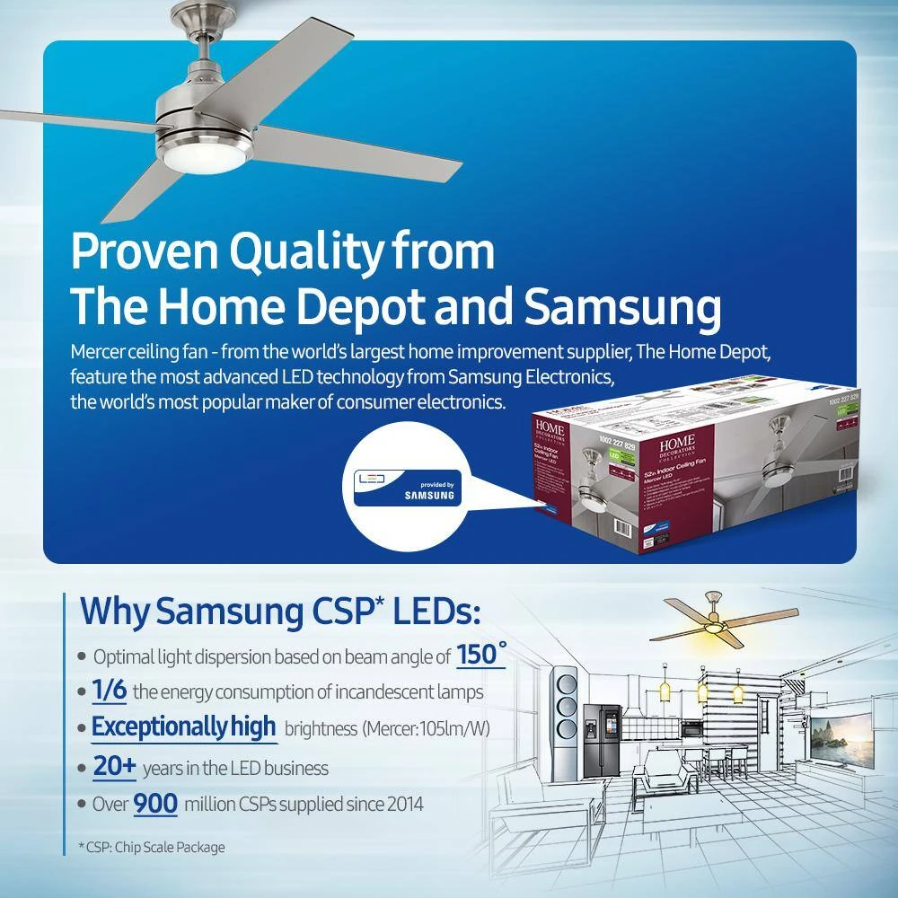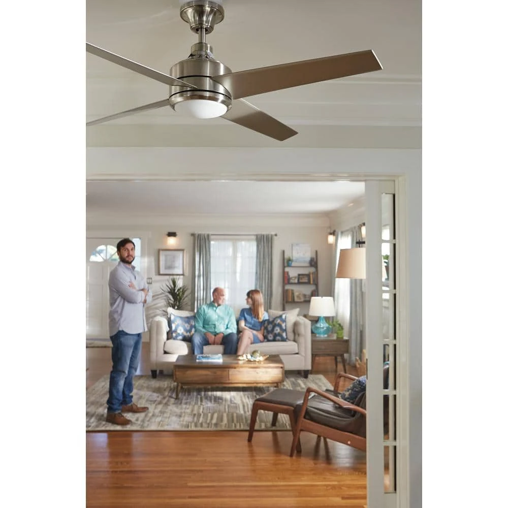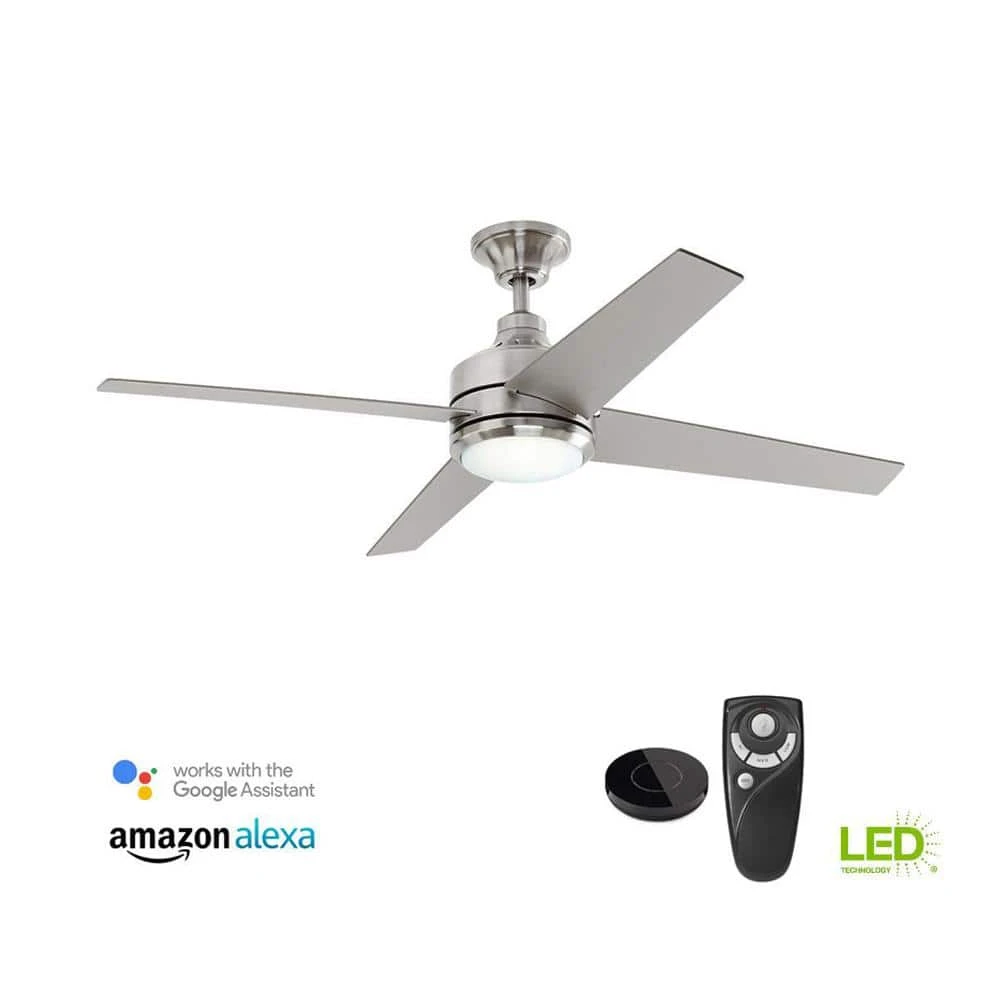 Easily integrate fan and light control into your Amazon or Google smart home system with this Bond ceiling fan bundle. The Bond remote control hub pairs with Alexa or Google Home to add voice control convenience to your ceiling fan. Cool down your home with a contemporary look with the Home Decorators Collection Mercer 52 in. LED Brushed Nickel Ceiling Fan. This 4-blade, 3-speed fan helps move air efficiently, with quiet, wobble-free operation. It offers an integrated light covered by an etched opal glass and includes a 14-Watt LED integrated module. If you’re tired of using the remote control and you want to include your traditional ceiling fan in your automated home system, the Bond is the simplest and quickest way to do so. The Bond Smart Wi-Fi Fan Remote Hub enables you to control your fan, along with the lighting that goes with it. The ceiling fan and BOND hub ship separately.