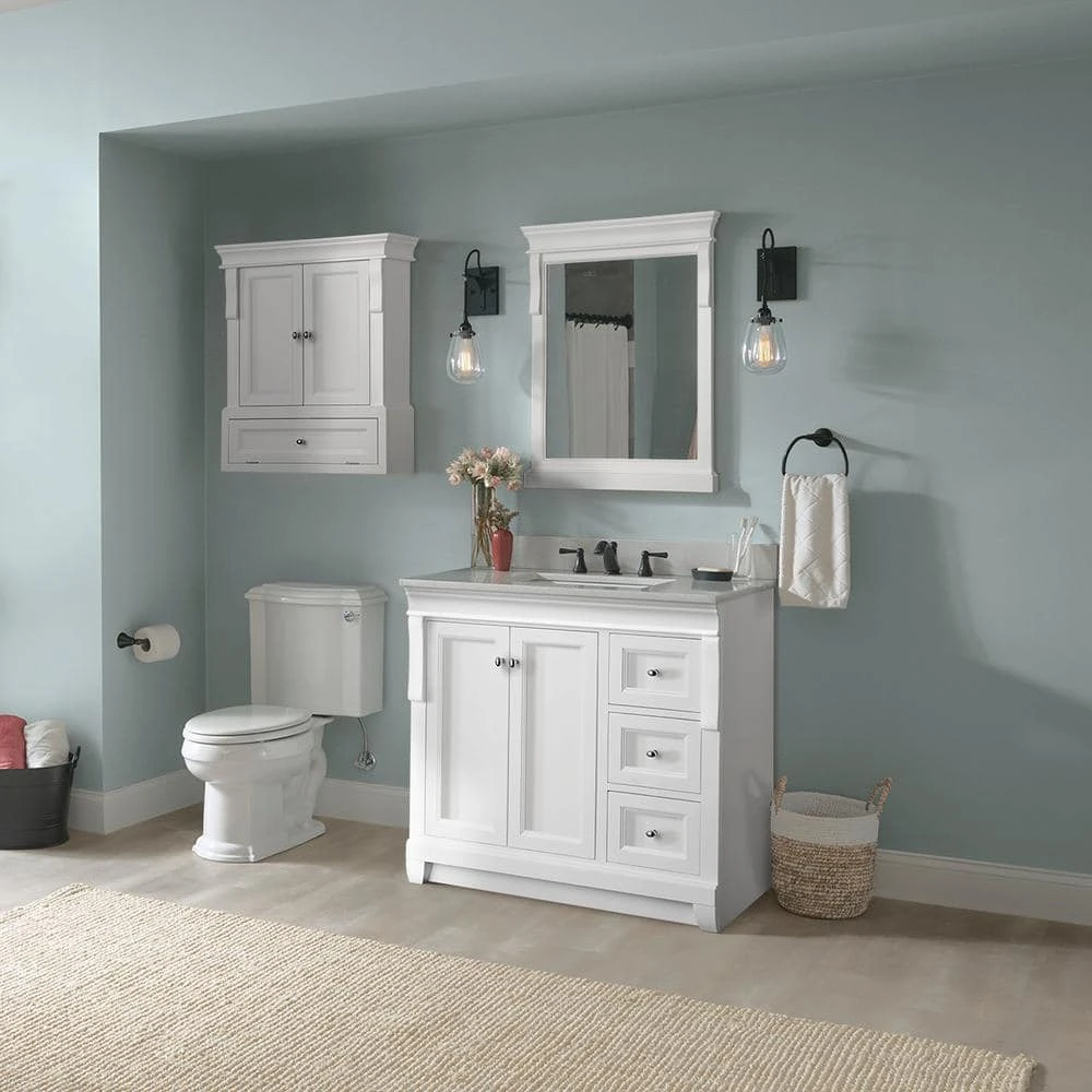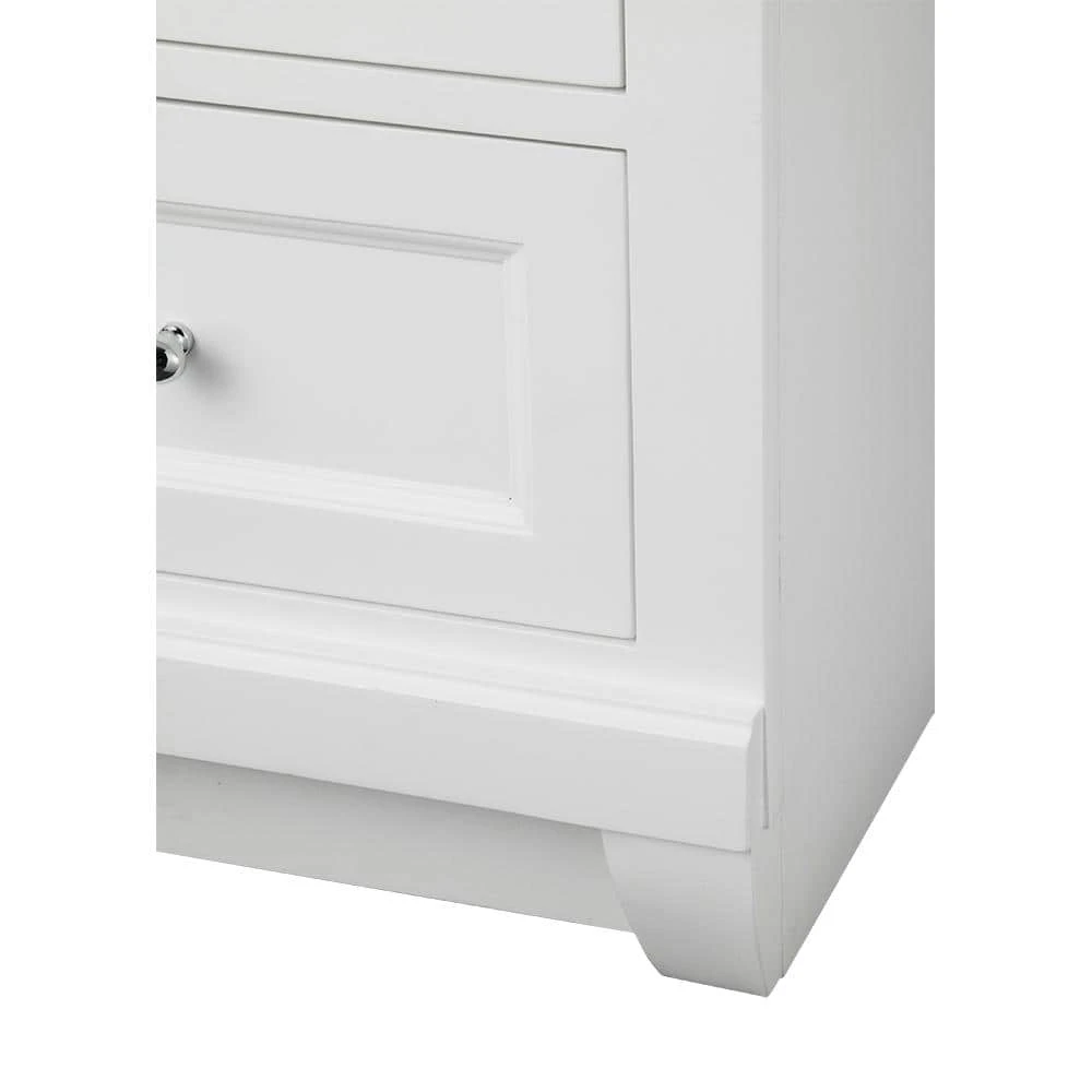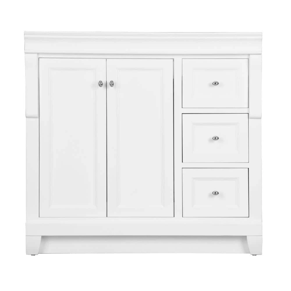 Awash with a bright white finish, this 36 in. vanity cabinet is full-bodied and sits flush with the floor. It is an attractive, stately piece with decorative accent boards that give it a splash of pizazz. Left-side double doors and three right-side drawers are equipped with gleaming chrome hardware, further enhancing its elegance. The solid, seamless construction gives homeowners and contractors the sense that it is custom-built, while the generous storage space within accepts bathroom accessories aplenty. Cap this white furniture-style bathroom vanity with a top/sink/faucet combination that ties the room together. Browse the Foremost Naples lineup for a wall mirror or linen/wall cabinet in the same white finish to augment your powder room makeover.