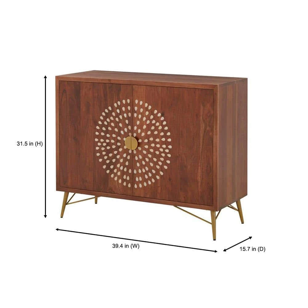 Our striking Home Decorators Collection sideboard has a narrow, slim profile that easily stores stacks of dinnerware, serving pieces, linens and more in a dining area or small room. Made of solid mango wood, the cabinet doors are inlaid with a circular pattern formed by multiple teardrops. A dark natural finish and golden legs add to its modern design.