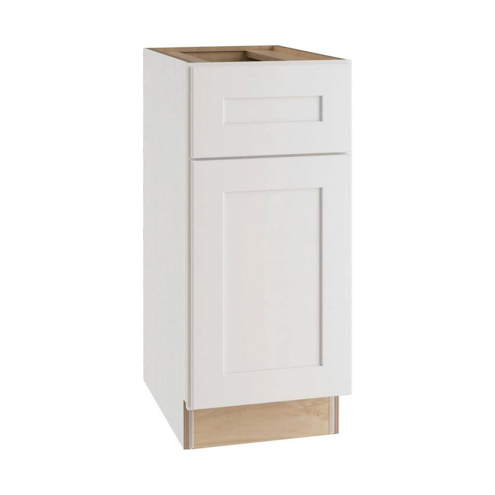 The Newport Pacific White door style from Home Decorators Collection features a clean white painted finish. This wide shaker style will create a clean bright feel in any kitchen. The 3 in. solid MDF frame doors and drawer fronts enclose a clean solid MDF recessed center panel. Cabinets feature CARB compliant all-plywood construction with full-depth 3/4 in. thick adjustable shelves for added storage.