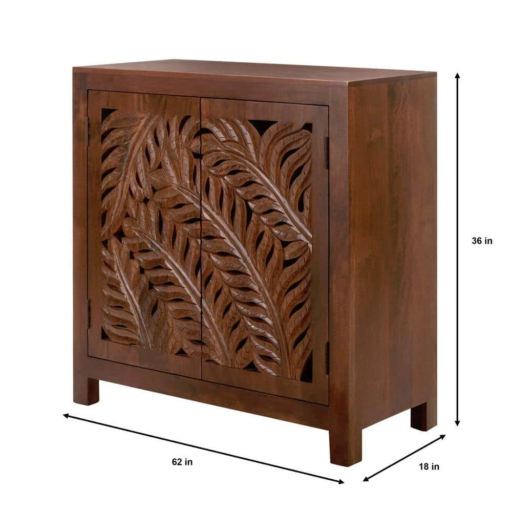 Keep clutter at a minimum with this HDC solid wood carved accent cabinet. The two front door panels feature a continuous swirl of carved floral and leaf patterns for an ornate look. With a walnut finish, this wooden cabinet brings a warm, cozy touch to your bedroom. A convenient shelf lets you organize books and other personal items, while the solid mango wood construction ensures lasting durability. Standing at 36 inches tall, this HDC solid wood carved accent cabinet makes a perfect nightstand.