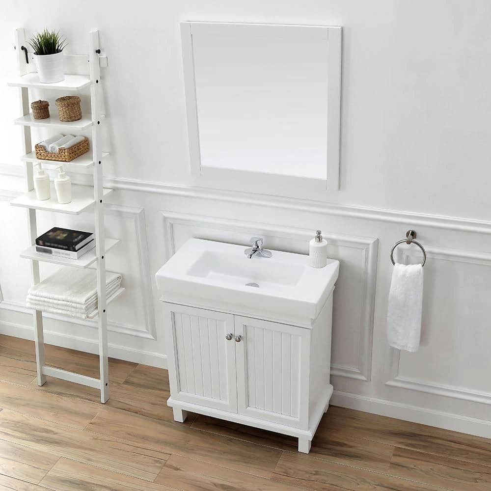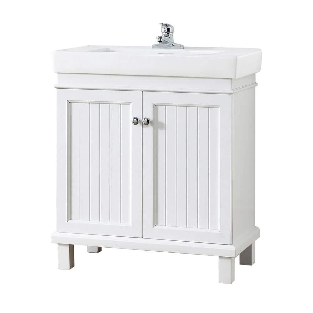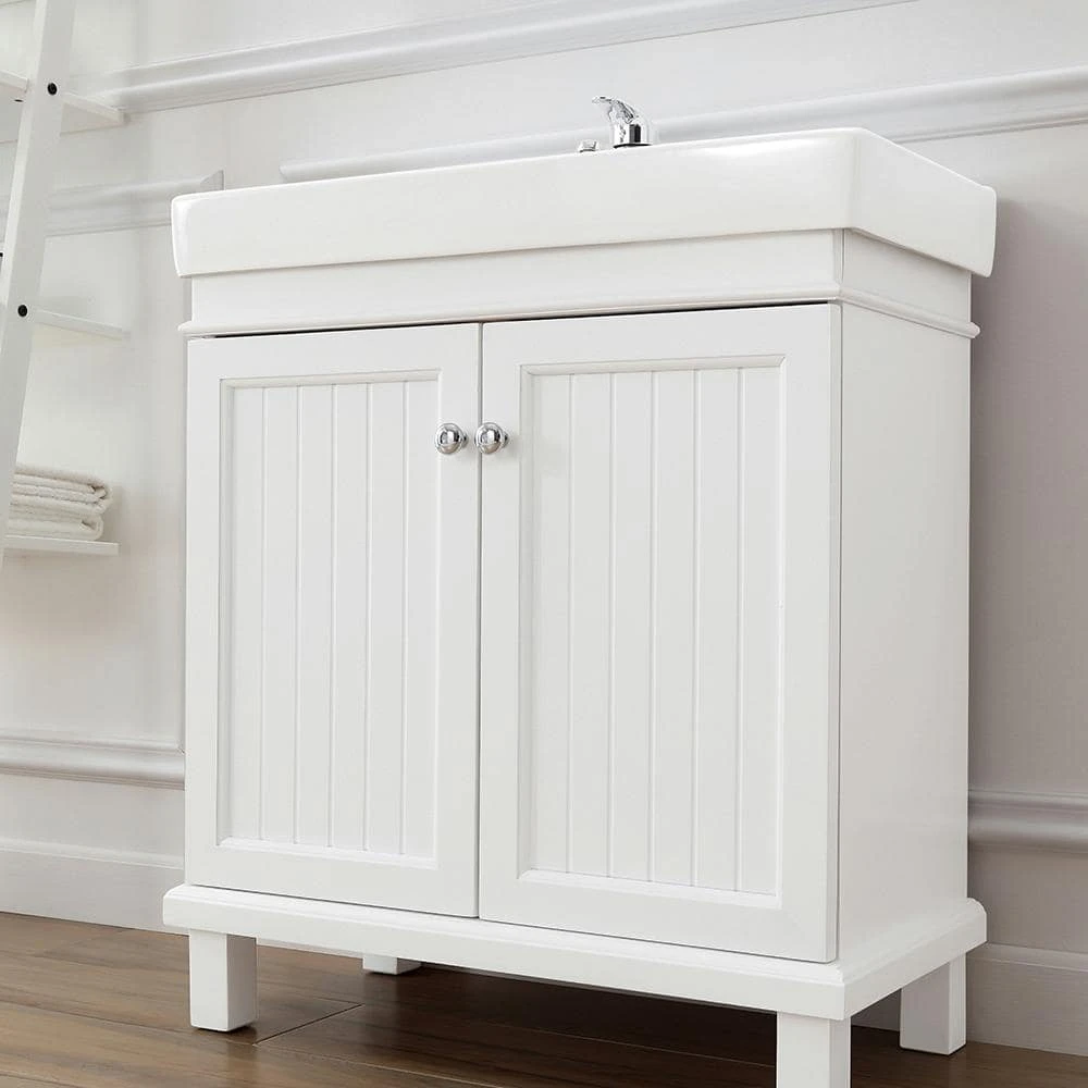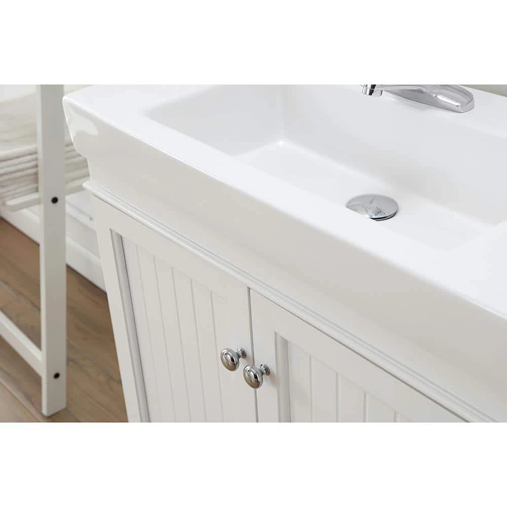 Cozy cottage style meets contemporary in the Parkbridge 30 in. vanity by Home Decorator’s Collection. Its classic white finish, beadboard paneled cabinet doors, modern countertop with integrated sink and sleek footed base is a timeless choice for any bathroom remodel. Pair with the Parkbridge white mirror for the perfect finishing touch.