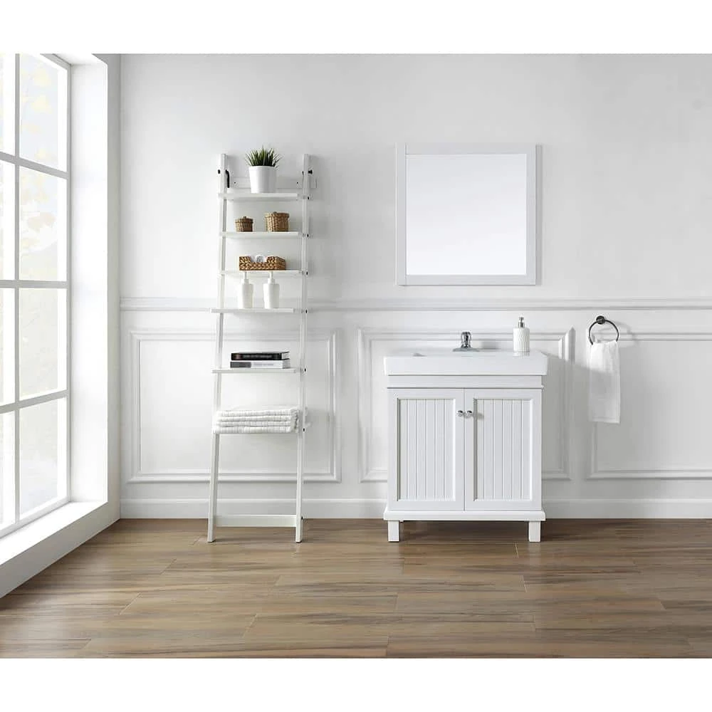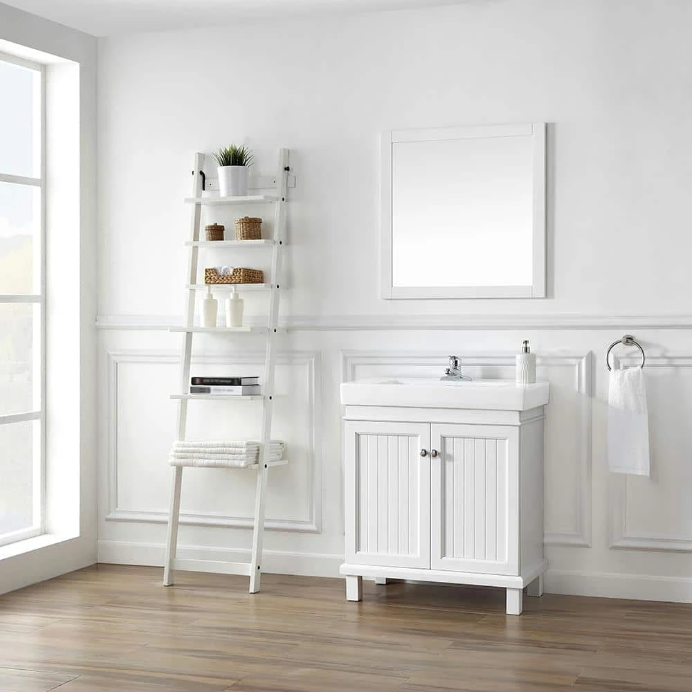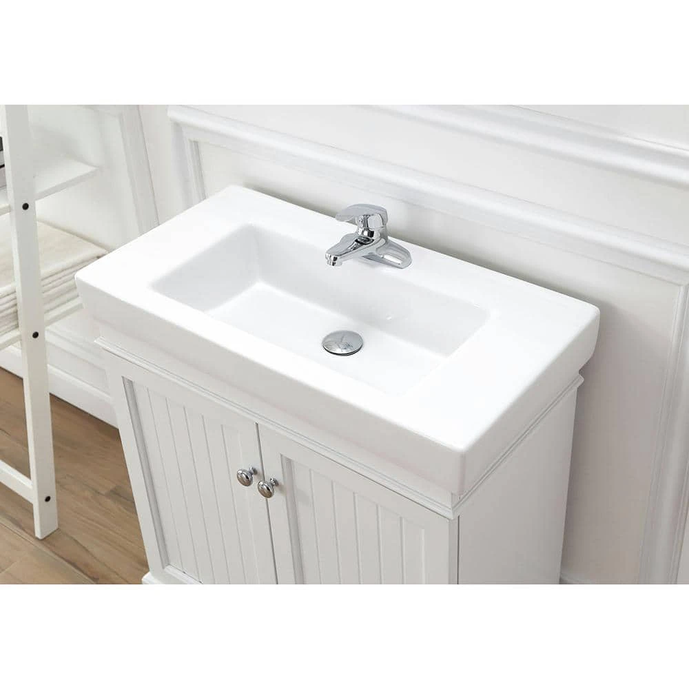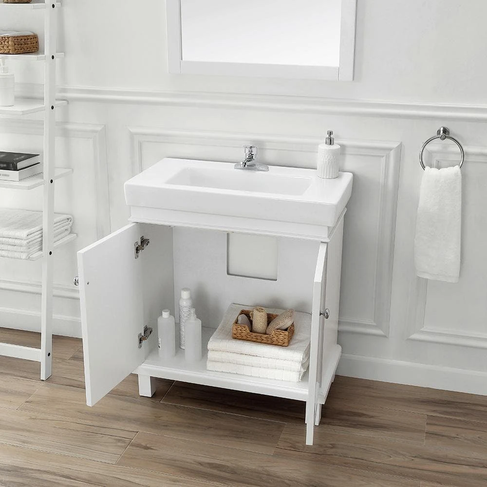 Cozy cottage style meets contemporary in the Parkbridge 30 in. vanity by Home Decorator’s Collection. Its classic white finish, beadboard paneled cabinet doors, modern countertop with integrated sink and sleek footed base is a timeless choice for any bathroom remodel. Pair with the Parkbridge white mirror for the perfect finishing touch.