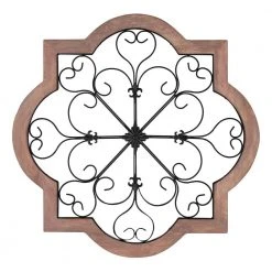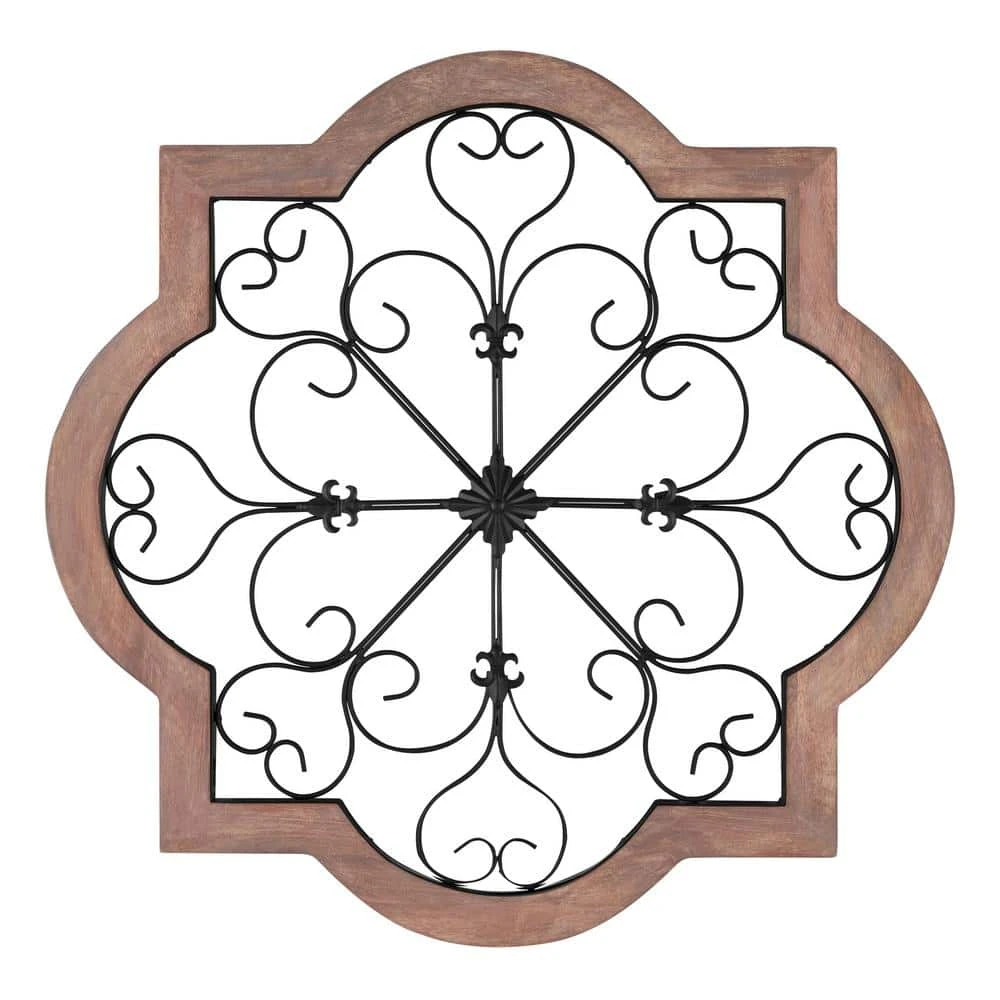 Dress up your living area with this Home Decorators Collection Quatrefoil Medallion Farmhouse Metal and Wood Dimensional Wall Art. The intricate metal artwork features swirling patterns, showcasing stunning symmetry and visual flair. With a brown wooden trim, this decorative accent delivers rustic-inspired aesthetic and complements your interior with a cozy, farmhouse vibe. This Home Decorators Collection structural wall art boasts pointed corners and arched sides, highlighting a unique, eye-catching design.