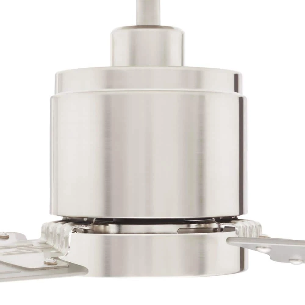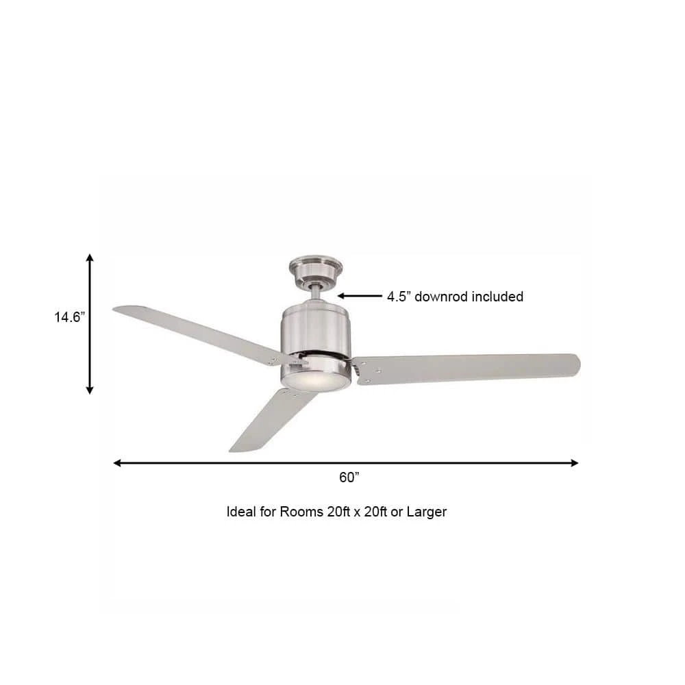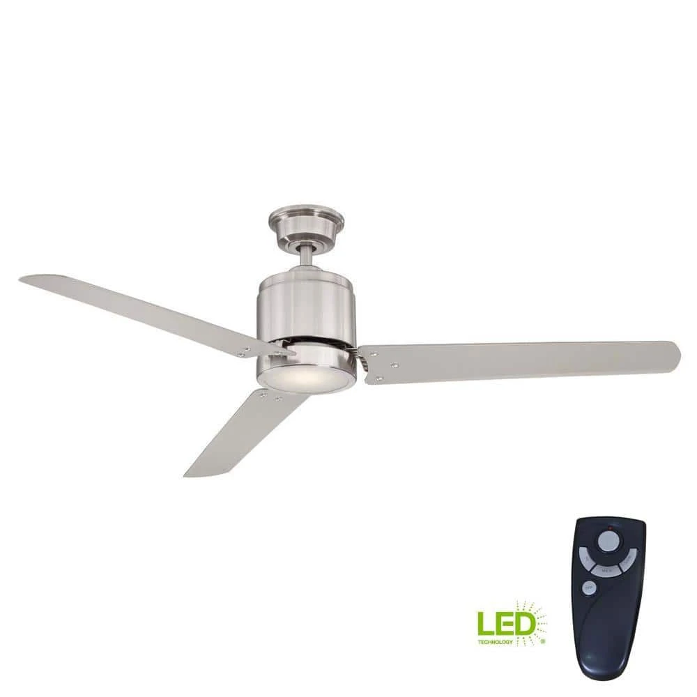 With a soft contemporary design, this Home Decorators Collection Railey LED 60 in. Brushed Nickel is sure to complement any room. It has three silver blades, and its integrated dome style light kit is nestled in frosted opal glass with a 16 W LED light source. The light is both energy efficient with a warmth of 3000K temperature; this fan will also push out 6,499 CFMs if needed. Easily and conveniently make adjustments to the fans speed and light setting with its hand-held remote.