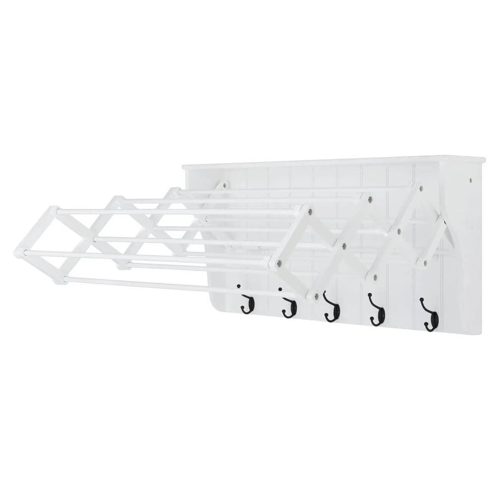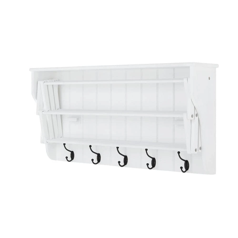 Store essentials and hang your clothing or towels with this HDC wood decorative wall shelf. Ample dimensions provide a space for displaying pictures or storing laundry detergent and softener, while five included hooks let you hang up bath towels or jackets. With 10 brackets, this unit affixes sturdily to your wall and handles frequent daily use. This HDC wood decorative wall shelf is constructed with solid wood and finished in crisp white, creating a classic look to enhance your bedroom or laundry room space.