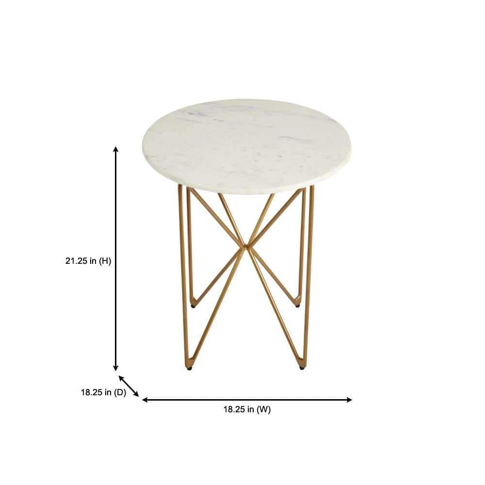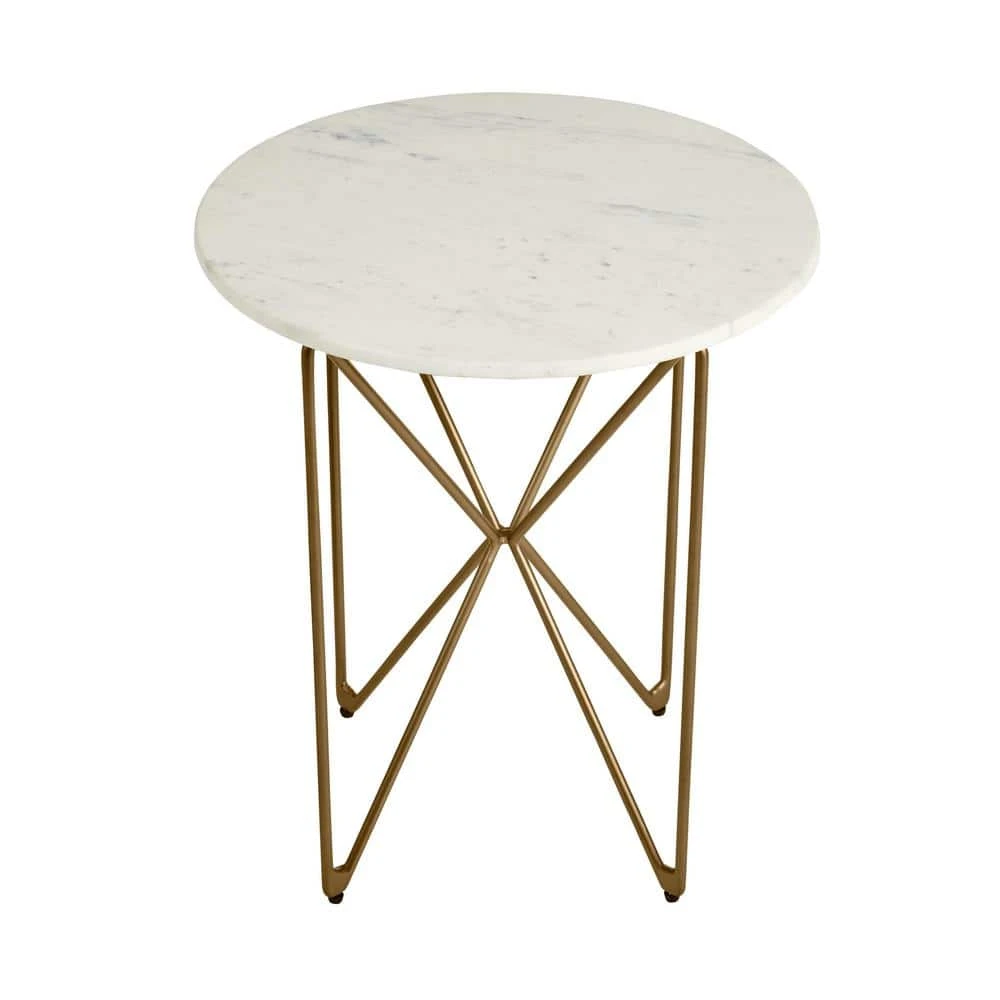 For a dash of modern glamour, our Home Decorators Collection accent table fits the need beautifully. The sculptural metal base shines in bold gold, with smoothly finished marble nestled on top. Scaled for smaller spaces, the modern round accent table cozies up to living room sofas or bedroom chairs.