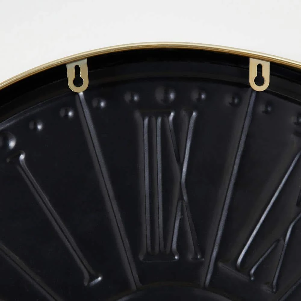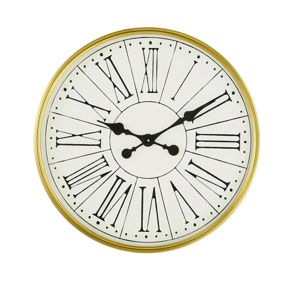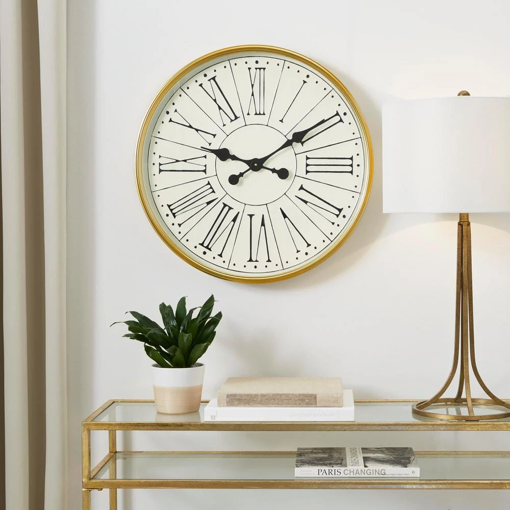 Keep time with this HDC round white and gold metal clock. A white finish and gold accents create a luxuriously modern look to fit easily into your living room or bedroom decor, while the attached keyhole hanger makes it simple to set up this clock around your home. Fasten this mechanical analog clock onto your kitchen or dining room wall to enjoy a refined and reliable timepiece. Generously sized, this HDC round white and gold metal clock adorns your walls with show-stopping sophistication.
