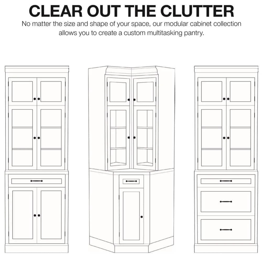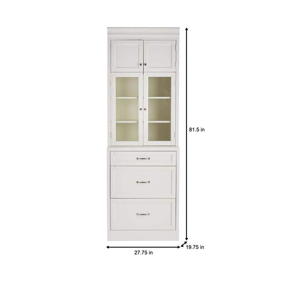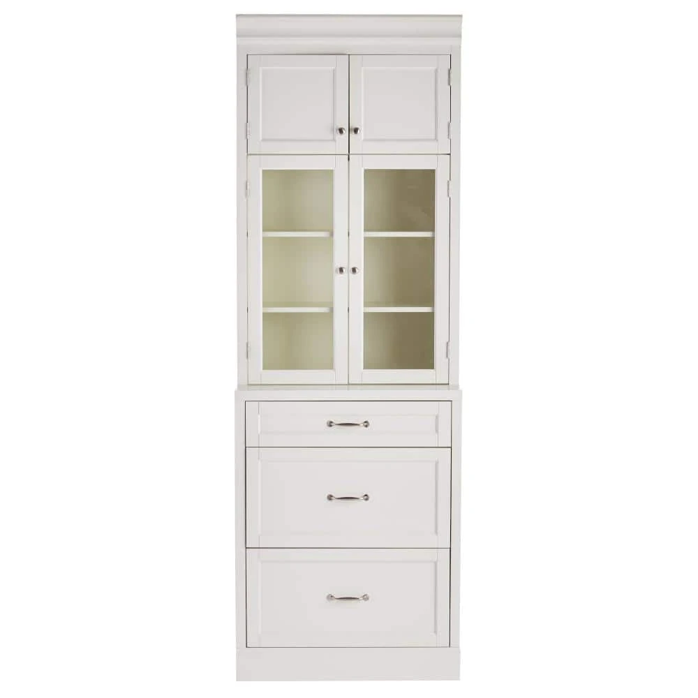 The Royce Modular Collection from Home Decorators Collection offers an easy way to create your perfect kitchen pantry without a costly remodel. All items in this collection boast generous crown molding, raised panels, a fresh true white finish and zinc hardware in a bronze finish. Each piece also features closed cubby-height cabinets above generous glass-door cabinets. Two of the pieces are standard freestanding cabinets; the third is a corner unit. This piece, the 3-Drawer Modular Storage Cabinet, is one of the standard cabinets. It features one short drawer and two taller drawers, perfect for keeping dish towels, wash rags, storage containers, baking accessories and other items organized and at hand. Put dishes and glassware on display behind the glass doors on two adjustable shelves; store even more in the cubby cabinets above.