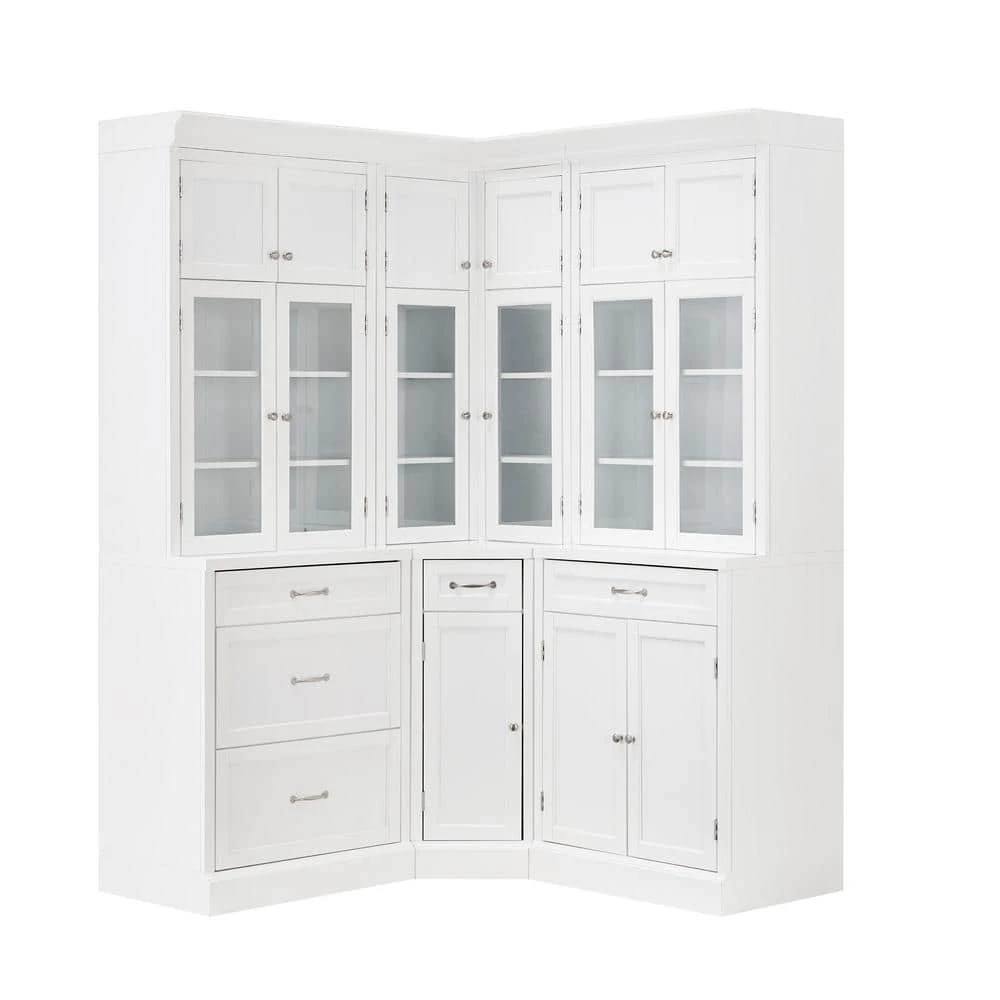 The Royce Modular Collection from Home Decorators Collection offers an easy way to create your perfect kitchen pantry without a costly remodel. All items in this collection boast generous crown molding, raised panels, a fresh true white finish and zinc hardware in a bronze finish. Each piece also features closed cubby-height cabinets above generous glass-door cabinets. Two of the pieces are standard freestanding cabinets; the third is a corner unit. This piece, the 1-Drawer Modular Storage Cabinet, is one of the standard cabinets. It features a wide top drawer and a large two-door cabinet with an adjustable interior shelf. The two shelves behind the glass doors are also adjustable, allowing you to customize shelf height to your kitchenware. Show off dishes and glassware while keeping pots, pans and small appliances out of sight with this versatile cabinet.