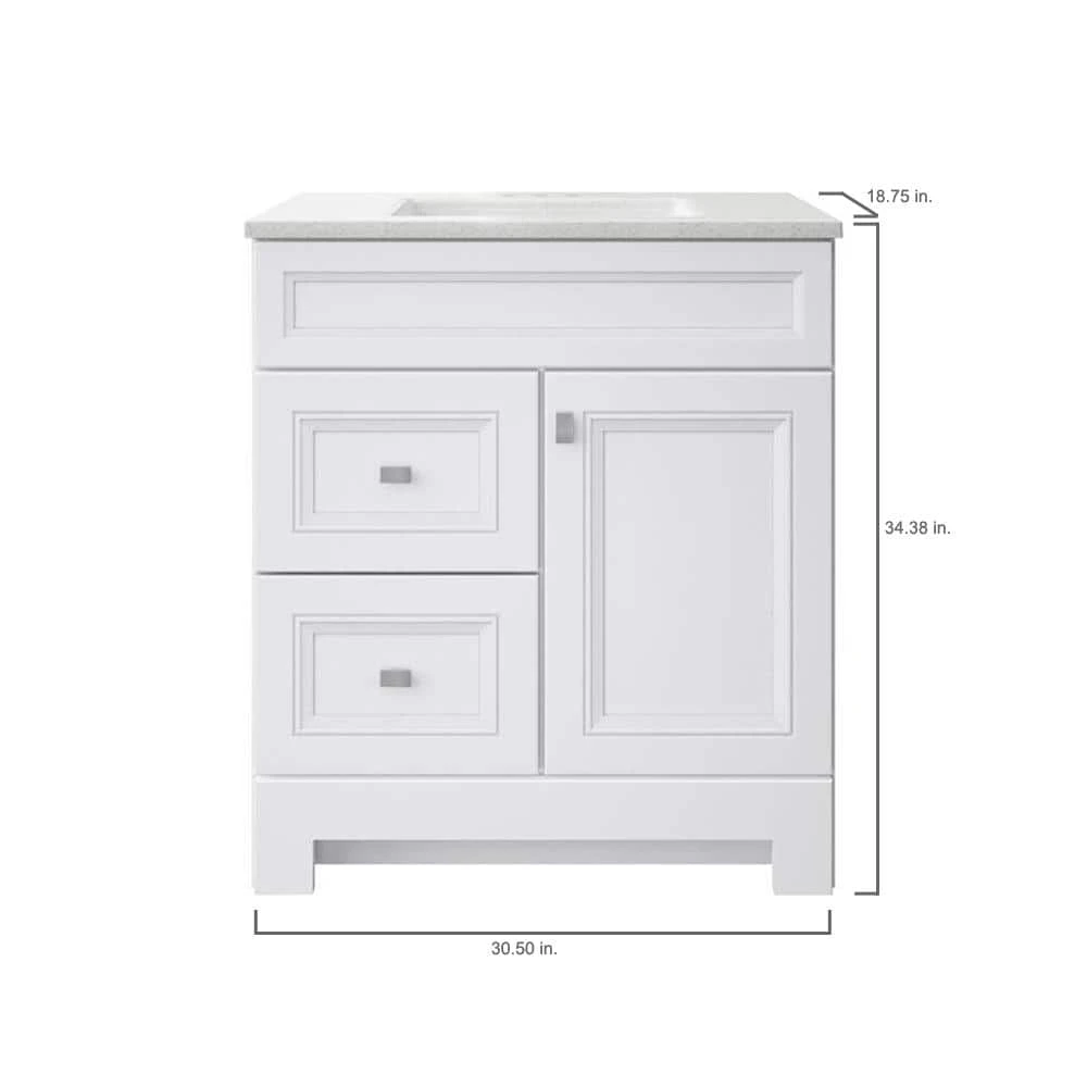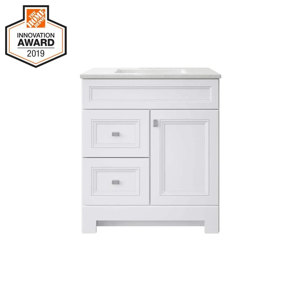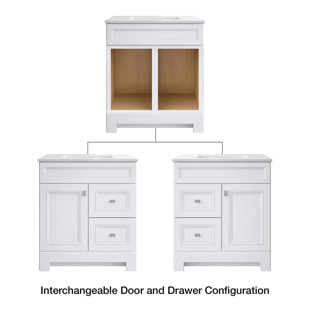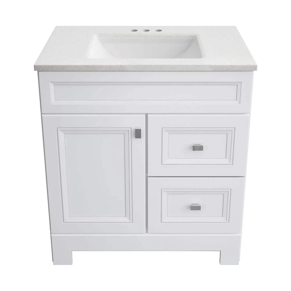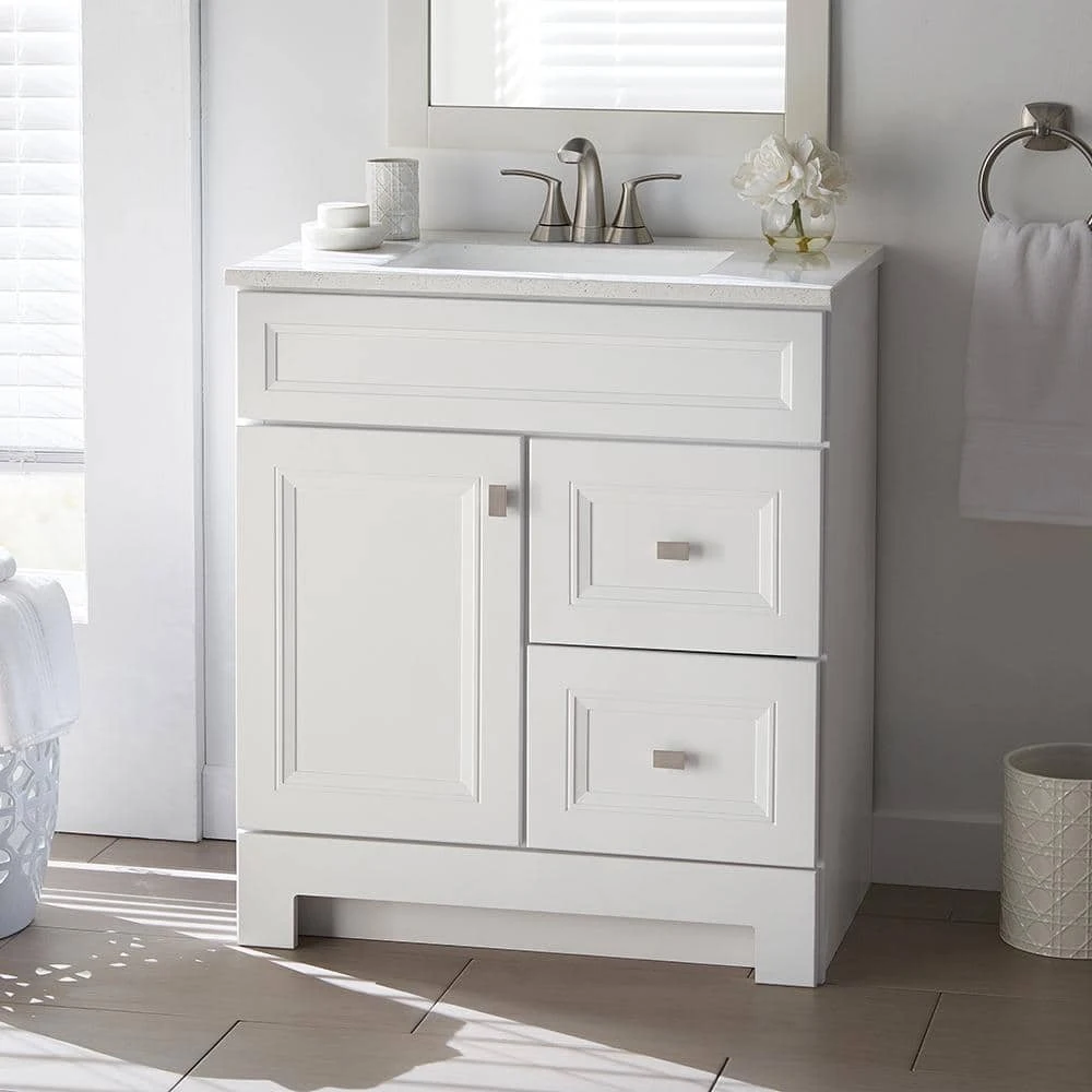 The 30 in. W Sedgewood Vanity in White with Solid Surface Technology Vanity Top in Arctic from Home Decorators Collection has a compact size, making it an ideal choice for a small bathroom. Stylish and attractive with traditional raised panel doors, this vanity has a white finish, a durable arctic solid surface technology vanity top with white bowl, a decorative toe kick and brushed nickel hardware. Additionally, the drawers and door can be swapped to be on the left or right. Pre-drilled for a 4 in. center set faucet, this vanity will provide ample storage and has a maple finished interior that is easy to clean.