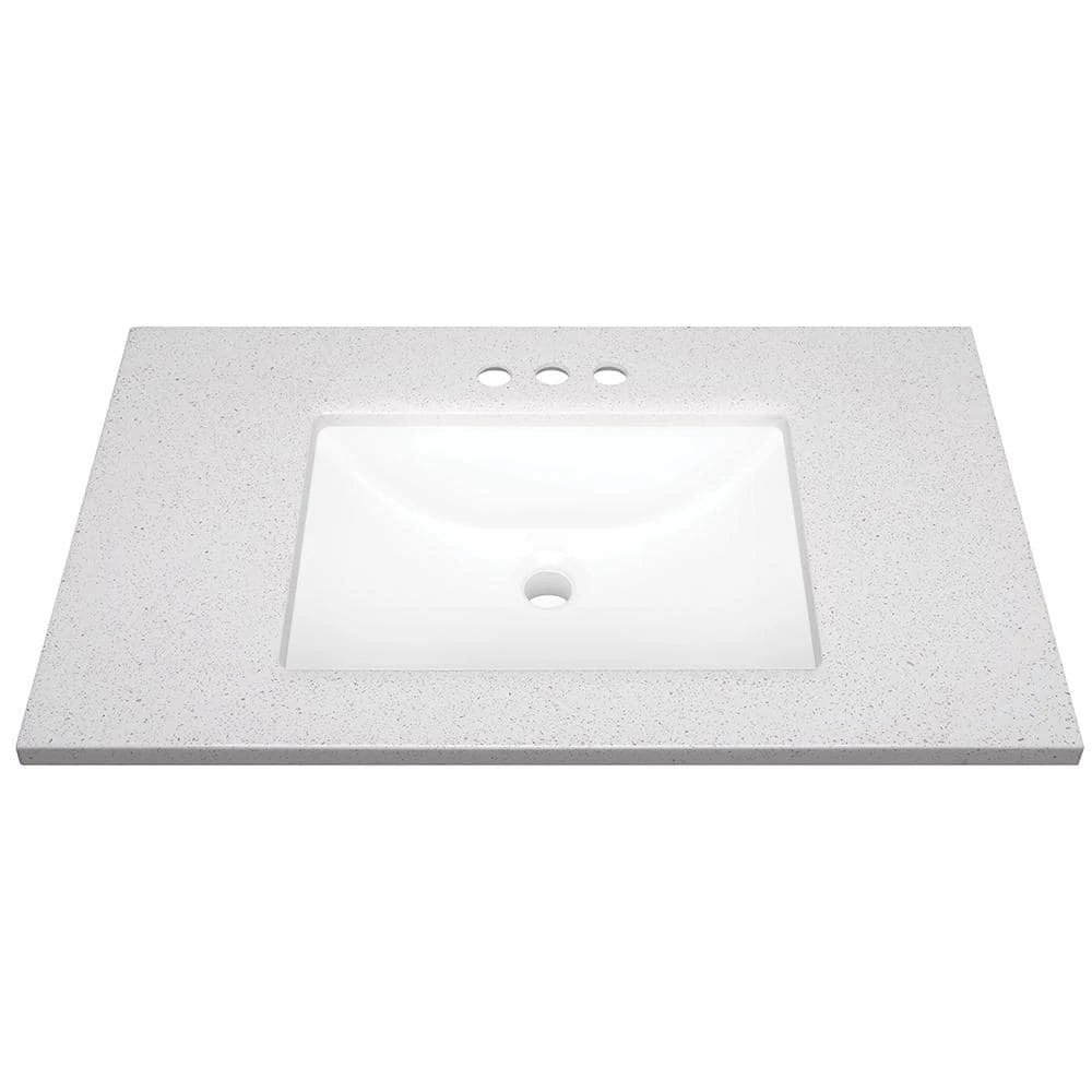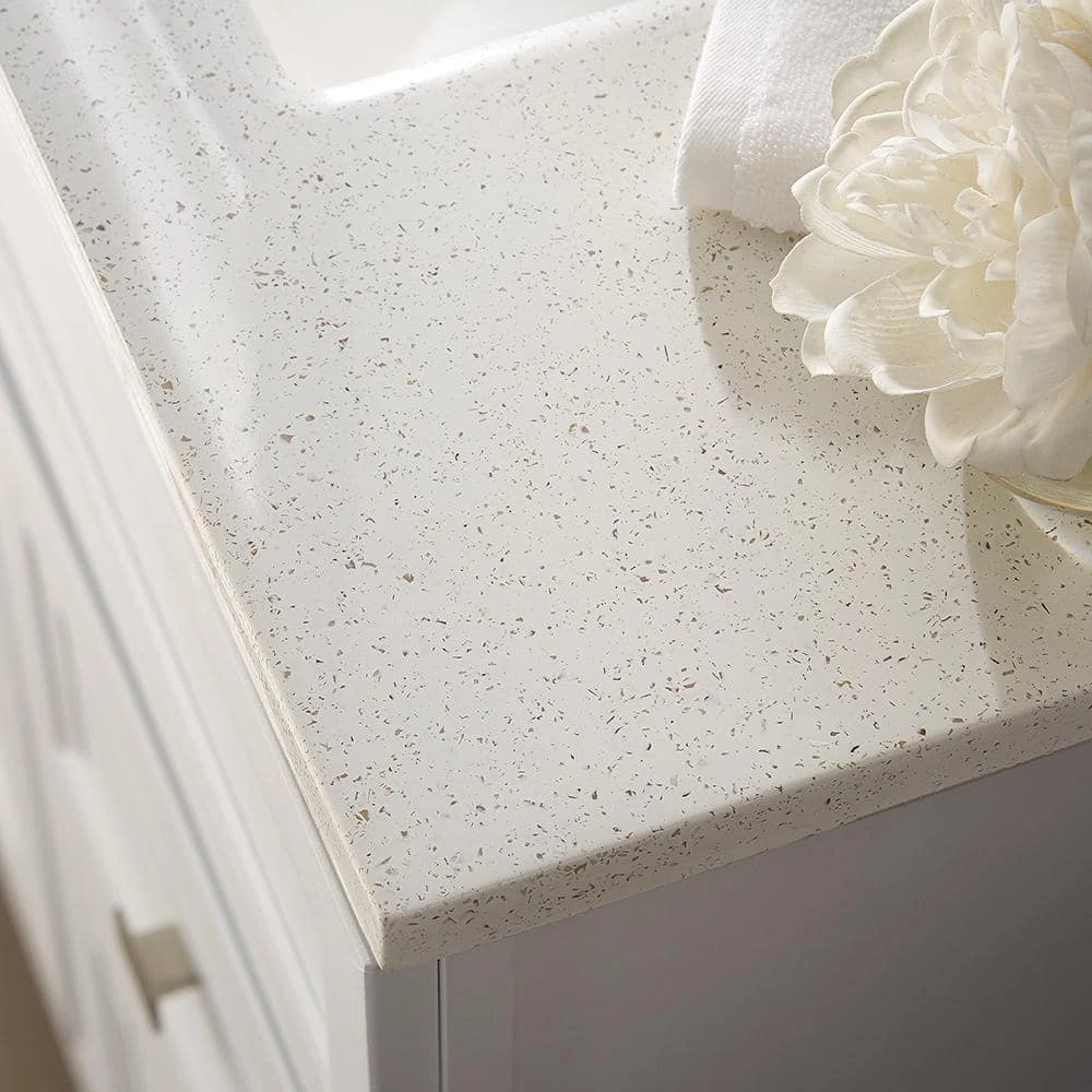 - Arctic-colored solid surface technology vanity top includes integral white sink for easy cleaning