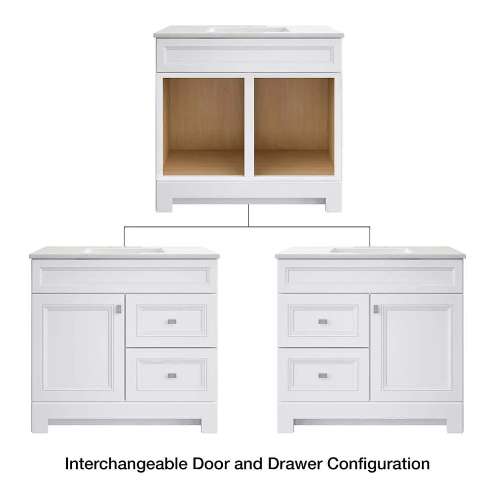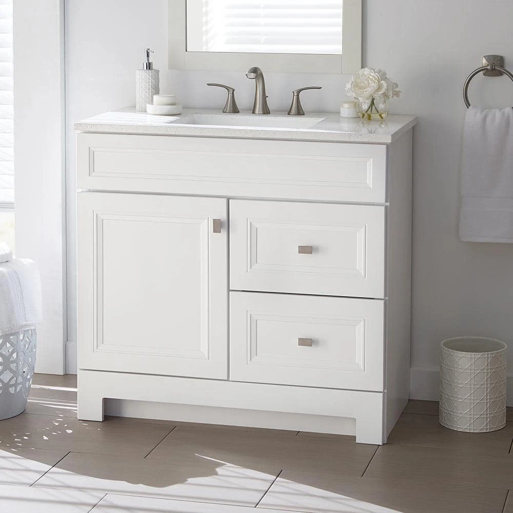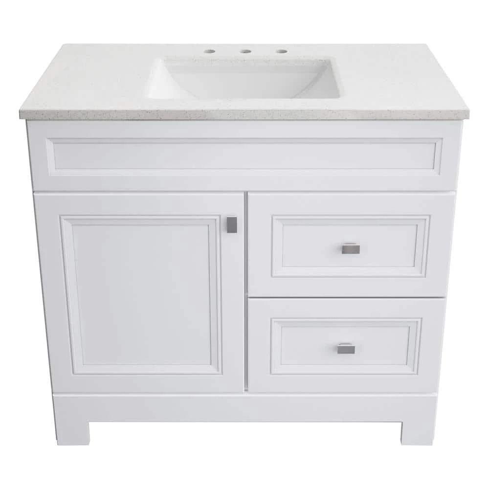 The 36 in. W Sedgewood Vanity in White with Solid Surface Technology Vanity Top in Arctic from Home Decorators Collection is an ideal choice a replacement bathroom vanity cabinet. Stylish and attractive with traditional raised panel doors, this vanity has a white finish, a durable arctic solid surface technology vanity top with white bowl, a decorative toe kick and brushed nickel hardware. Additionally, the drawers and door can be swapped to be on the left or right. Pre-drilled for a 8 in. widespread faucet, this vanity will provide ample storage and has a maple finished interior that is easy to clean.