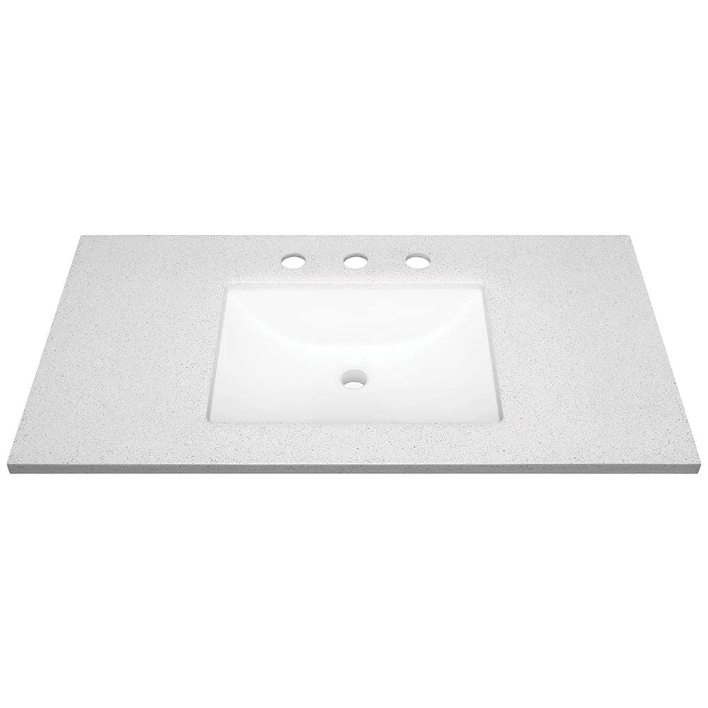 - Arctic-colored solid surface technology vanity top includes integral white sink for easy cleaning
