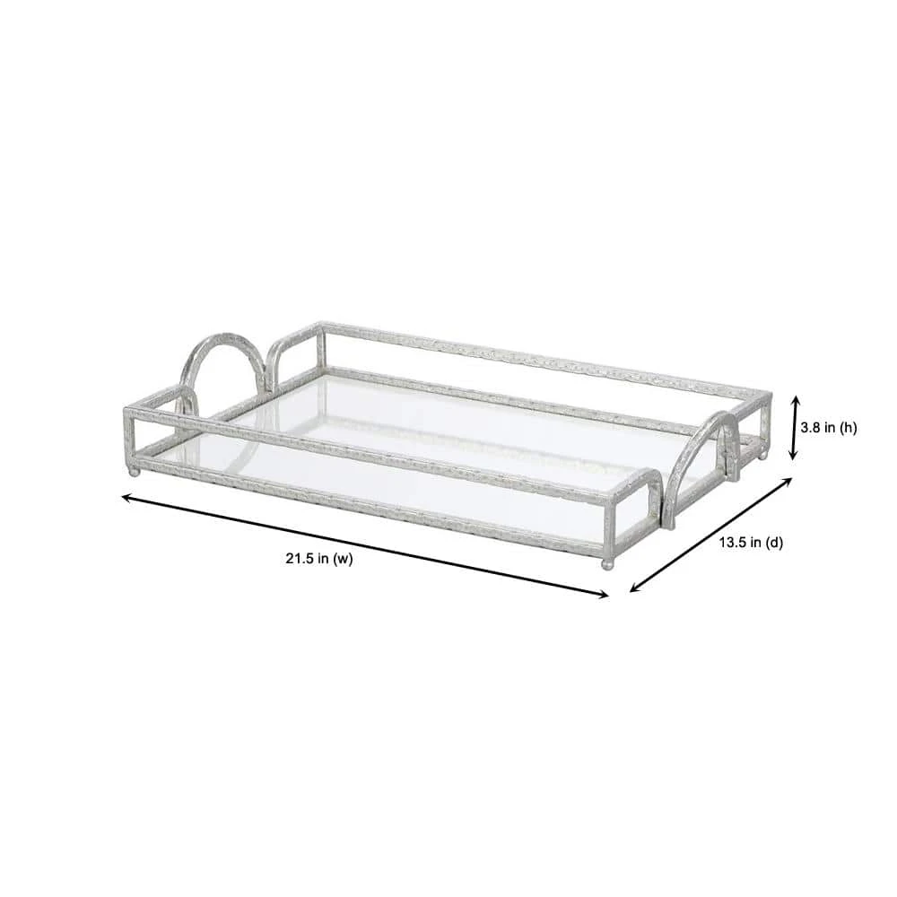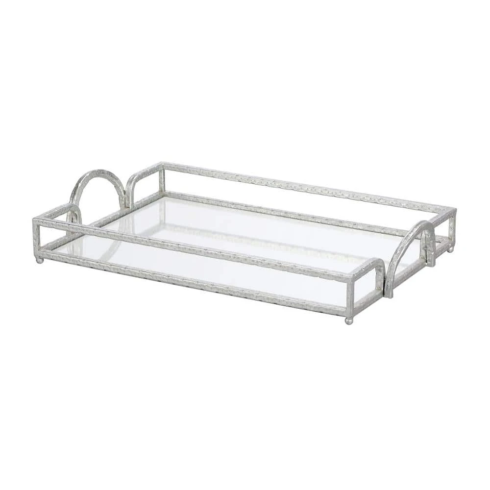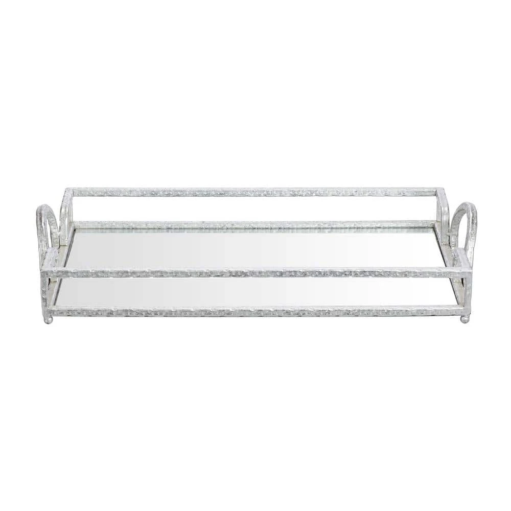 Add a touch of sparkling grace to your entryway table or showcase with the Silver Hammered Metal Decorative Rectangle Mirror Tray from Home Decorators Collection. It features a silver metal framework with a hammered finish that complements a classic-glam decor. The mirrored platter surface serves as an ideal platform for arranging showpieces and ornaments creatively. The tray has two handles that enable easy carrying. Use a soft, dry cloth to wipe this decorative tray for a clean and shiny look.
