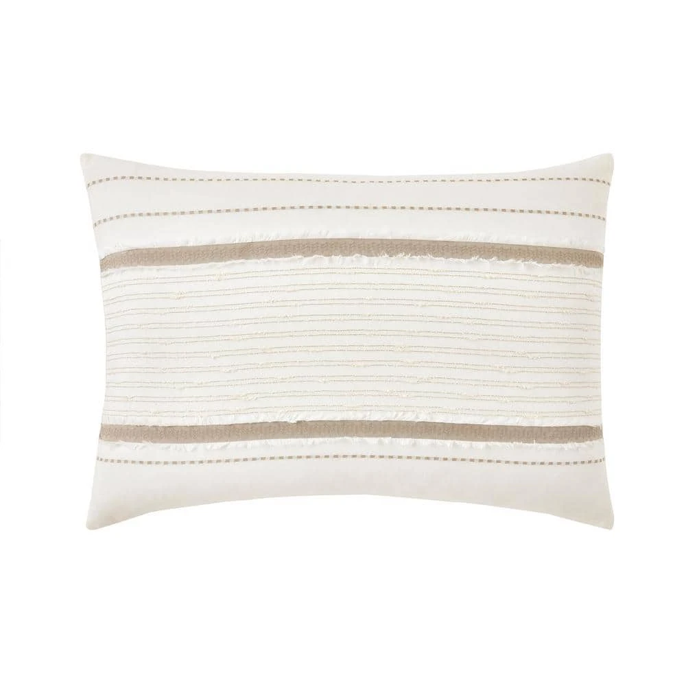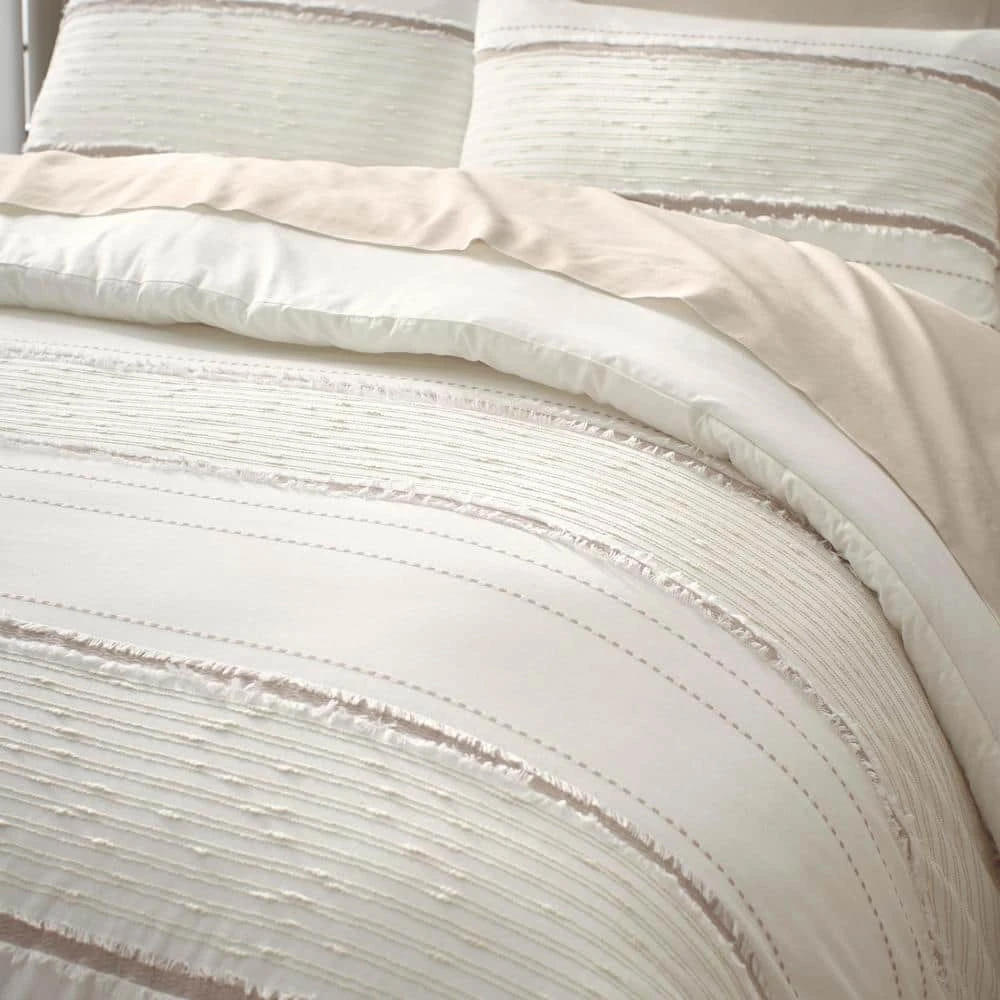 Add a light touch of texture to your bed with the Home Decorators Collection Sonata 3-Piece Natural Ivory Cream Textured Stripe Cotton Comforter Set. Crafted with a 100% cotton shell, this ivory cream comforter set provides ultimate cozy comfort for a perfect night’s sleep. This boho comforter set also features a mix of natural ivory, cream, and beige color tones that are easy to match with your favorite decor. The comforter’s striped design with clipped ends even adds soft texture and dimension to your bed. Two king pillow shams and an ample comforter make it easy to set up your guest room or master bed, and the machine washable construction is effortless to maintain.
