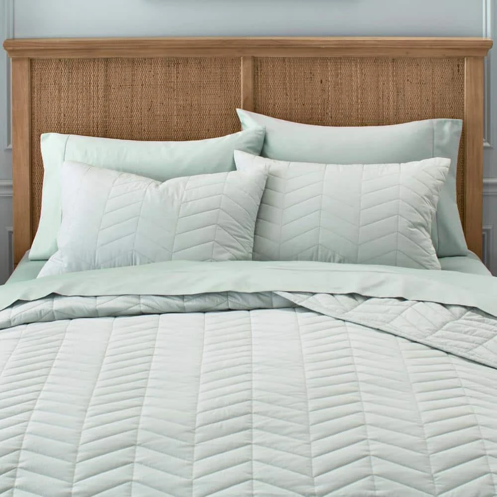Refresh your restful retreat with this Home Decorators Collection Spring Hill Sea Breeze Green Diamond Cotton Quilt Set. Bringing coastal and summery vibes, this light green quilt set features a diamond quilted design that creates a classic, timeless look for your room. Being ultra lightweight, this quilt set is perfect for those who tend to sleep hot but still enjoy the cozy feeling of bedding. This diamond quilt set can also easily work layered in between a comforter or duvet cover for those who love to be bundled up at night, or for transitioning seasons. Two standard pillow shams and an ample comforter make it easy to set up your guest room or master bed, and the machine washable construction is effortless to maintain.