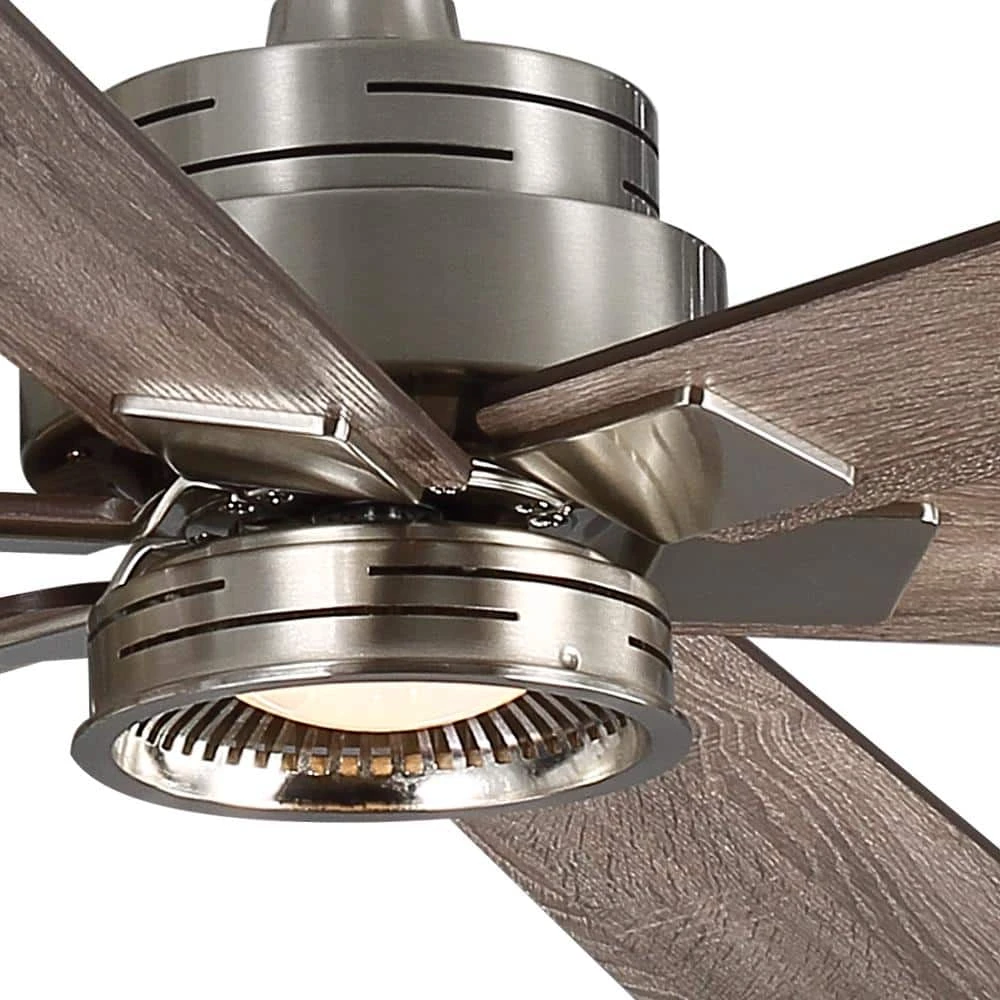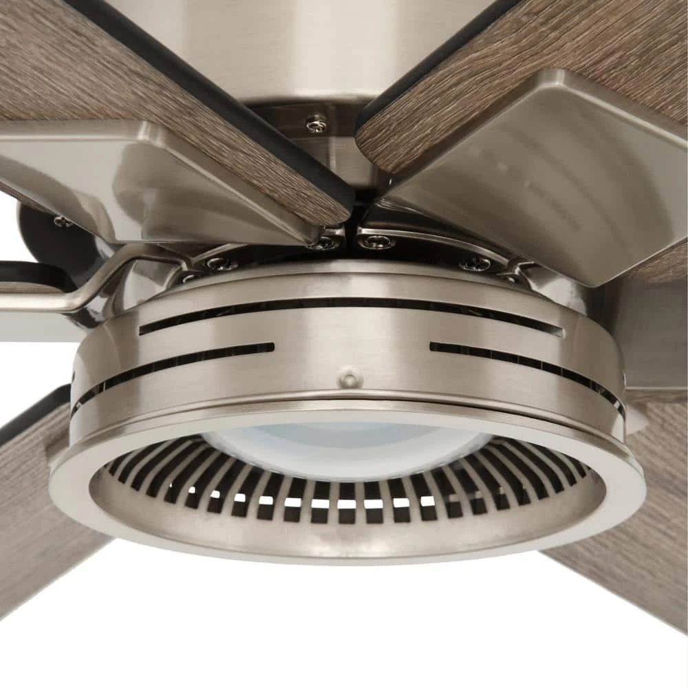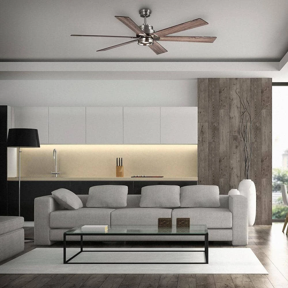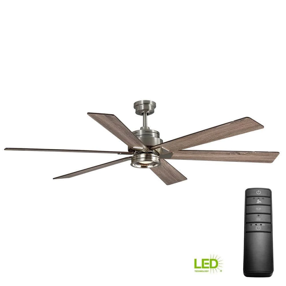 Cool down any large room with the 70 in. Statewood ceiling fan from the Home Decorators Collection. This ceiling fan features a modern light kit, brushed nickel finish and six reversible, matte black/gray wash blades that complement many decors. It’s easy to get the perfect settings with the remote, which controls the speed functions, independent light and the Comfort Breeze feature for a natural breeze effect. The 18-W LED light is dimmable and requires no maintenance.