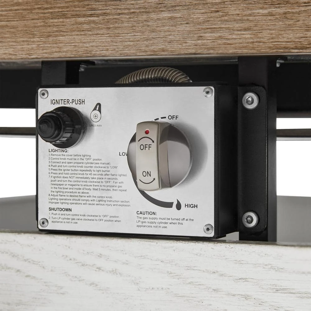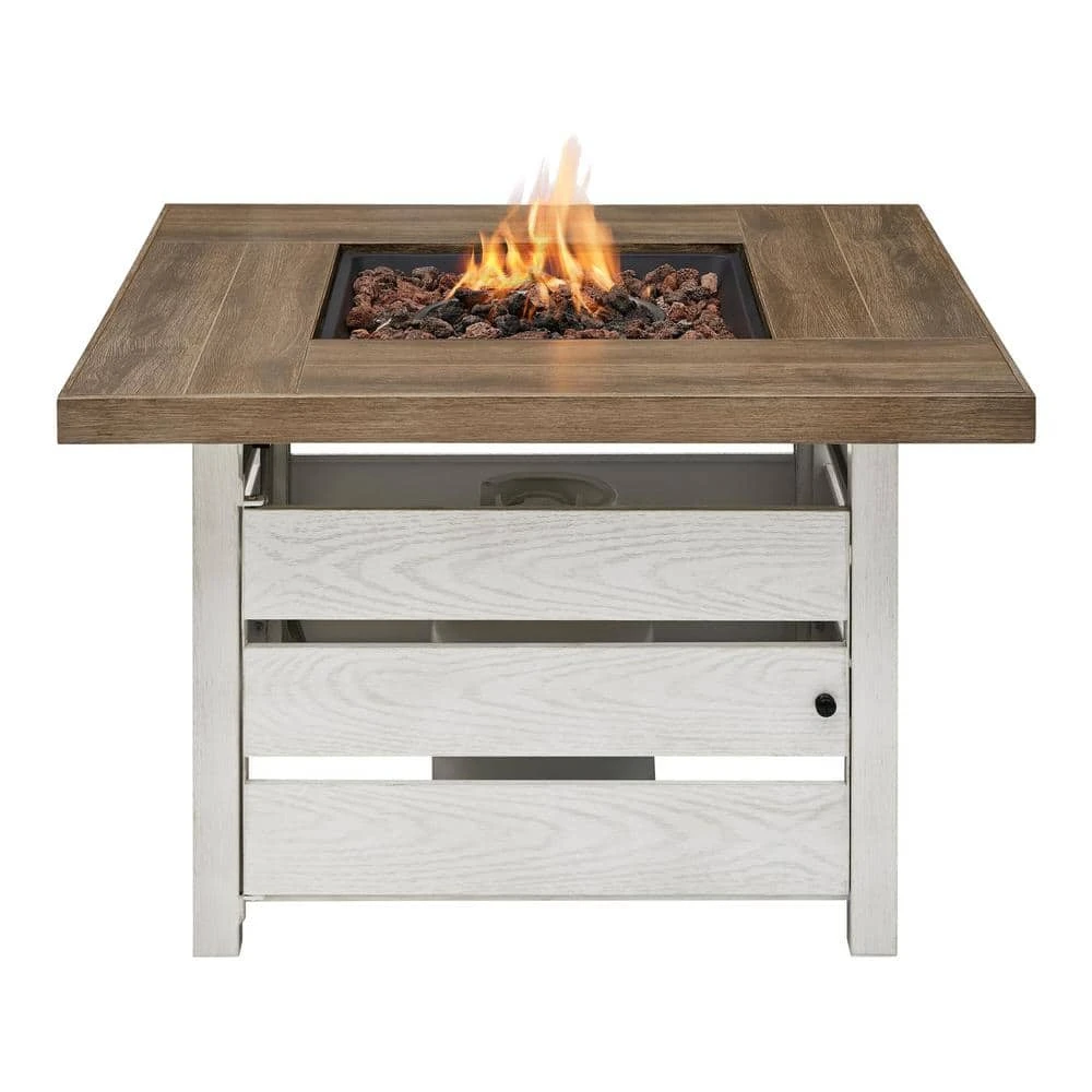 Add warmth, style and function to your outdoor space with this Summerfield gas fire pit. The weathered-white wood-grain finish offers beautiful light styling to brighten up your outdoor living space. With 10 inches of mantel on all four sides of the fire bowl, this 39.5 in. square gas fire pit offers plenty of tabletop space for dining and entertaining while gathered around the warm flames. Pairs well with light color metal, wicker, or wood patio furniture.