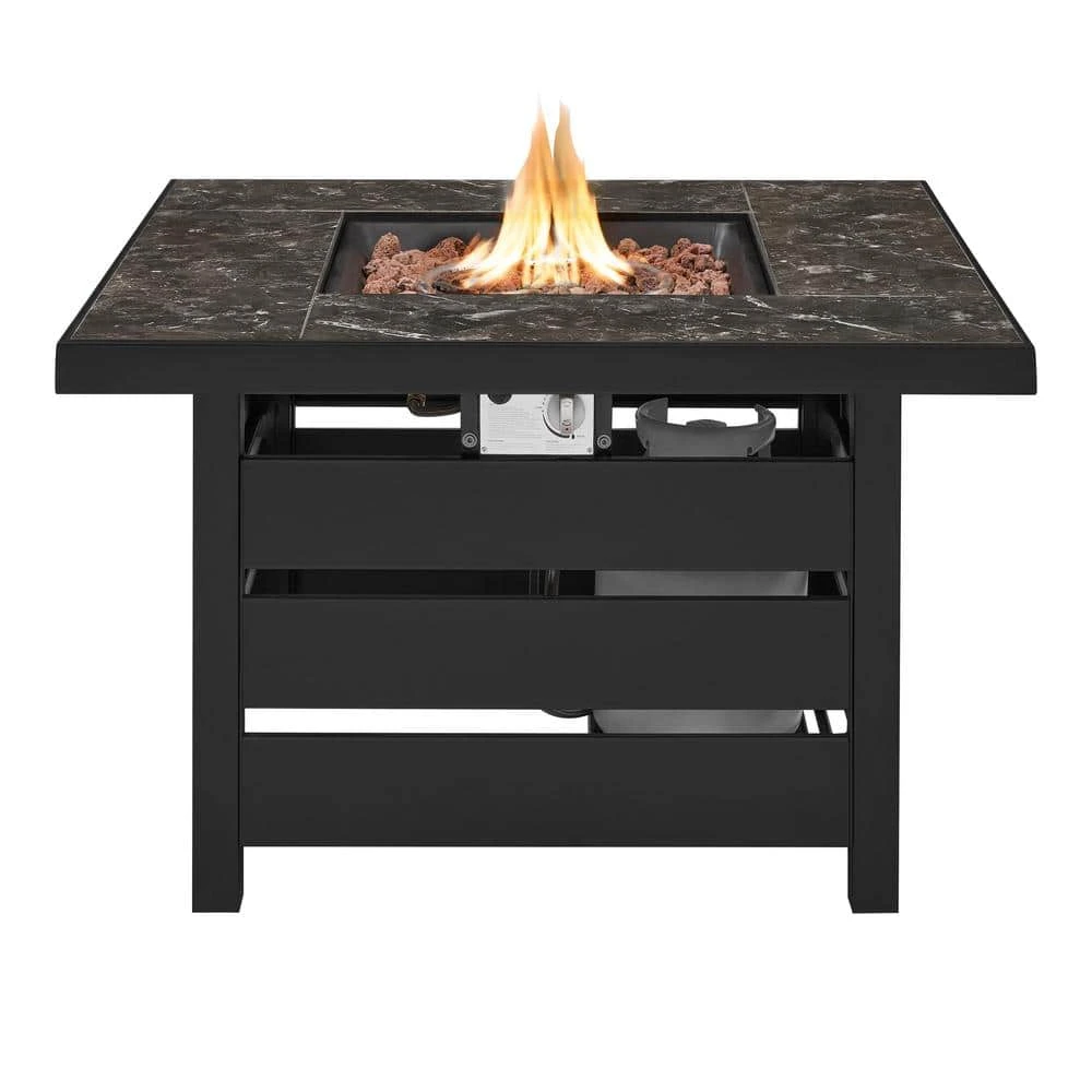 Add warmth, style and function to your outdoor space with this Summerfield gas fire pit. The black marble tile top offers a beautiful upscale look to dress up your outdoor space. With 10 inches of mantel on all four sides of the fire bowl, this 39.5 in. square gas fire pit offers plenty of tabletop space for dining and entertaining while gathered around the warm flames. Pairs well with dark color metal, wicker, or wood patio furniture.