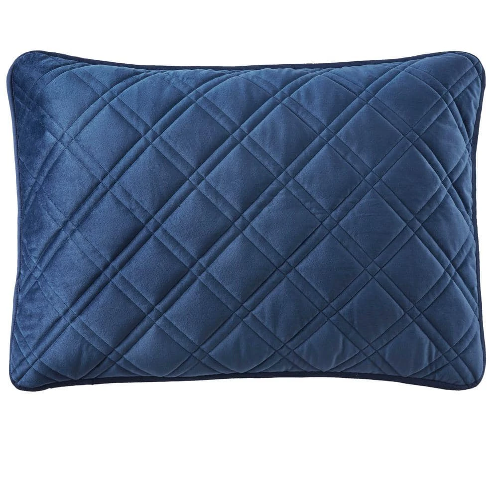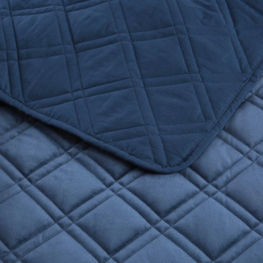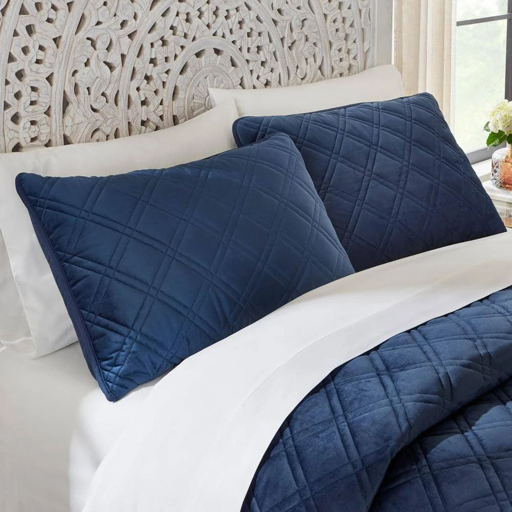 - Deep midnight blue velvet quilt set, embroidered in a classic diamond geometric pattern for a lavish look and feel