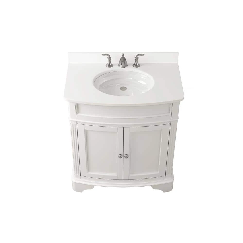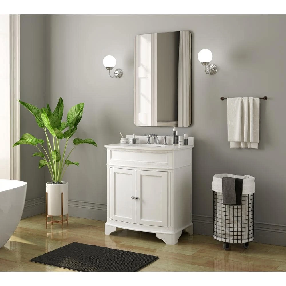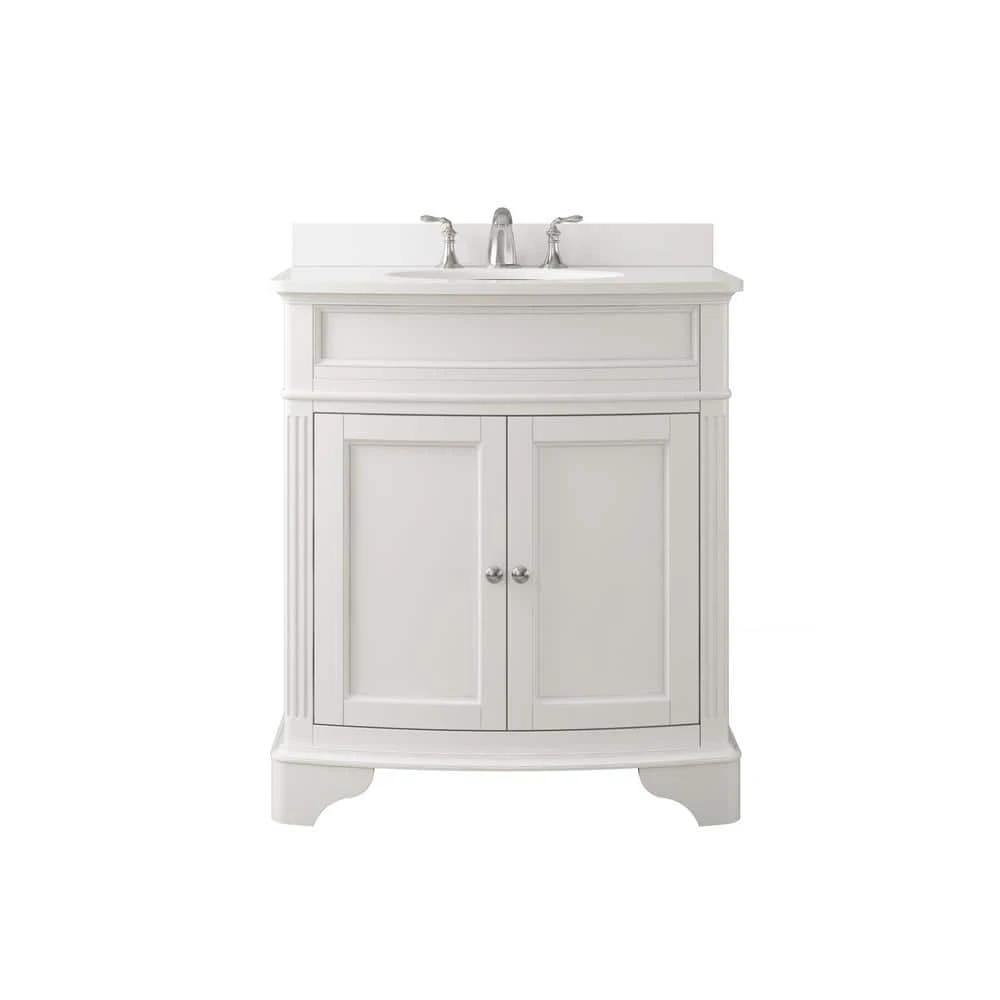 This modern-styled Terryn 31 in. Vanity creates a perfectly luxurious feel for a modern bathroom. It features high-quality materials ideal for regular heavy use, including a single under-mount ceramic sink, engineered white marble, environmentally friendly paint finish that blends with a wide range of interior designs. The luminous, luxurious white marble evokes ambiance to your bathroom, projecting a feel of glamour and comfort. It includes a marble backsplash sealed with a protective lacquer which constantly resists moisture damage. This modern-styled single bathroom vanity serves as a buoyant storage solution for bathroom necessities with two-door compartments. The dual heavy-duty gel coated surface sink is highly resistant to stain, dirt and grime, allowing easy maintenance. It is deliberately designed with the best quality materials to ensure ease of use and low maintenance cost. The marble backsplash on this bathroom furniture projects aesthetic appeal, which naturally improves your bathroom decor. The vanity is ideal when remodeling the existing bathroom to look more classic and elegant.