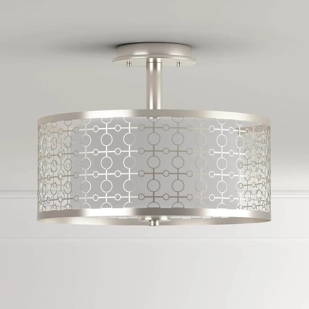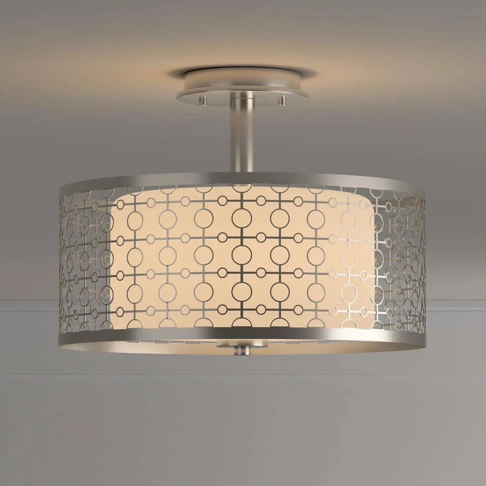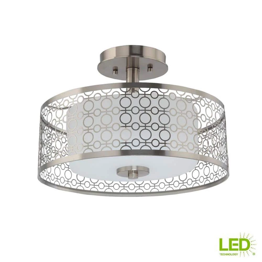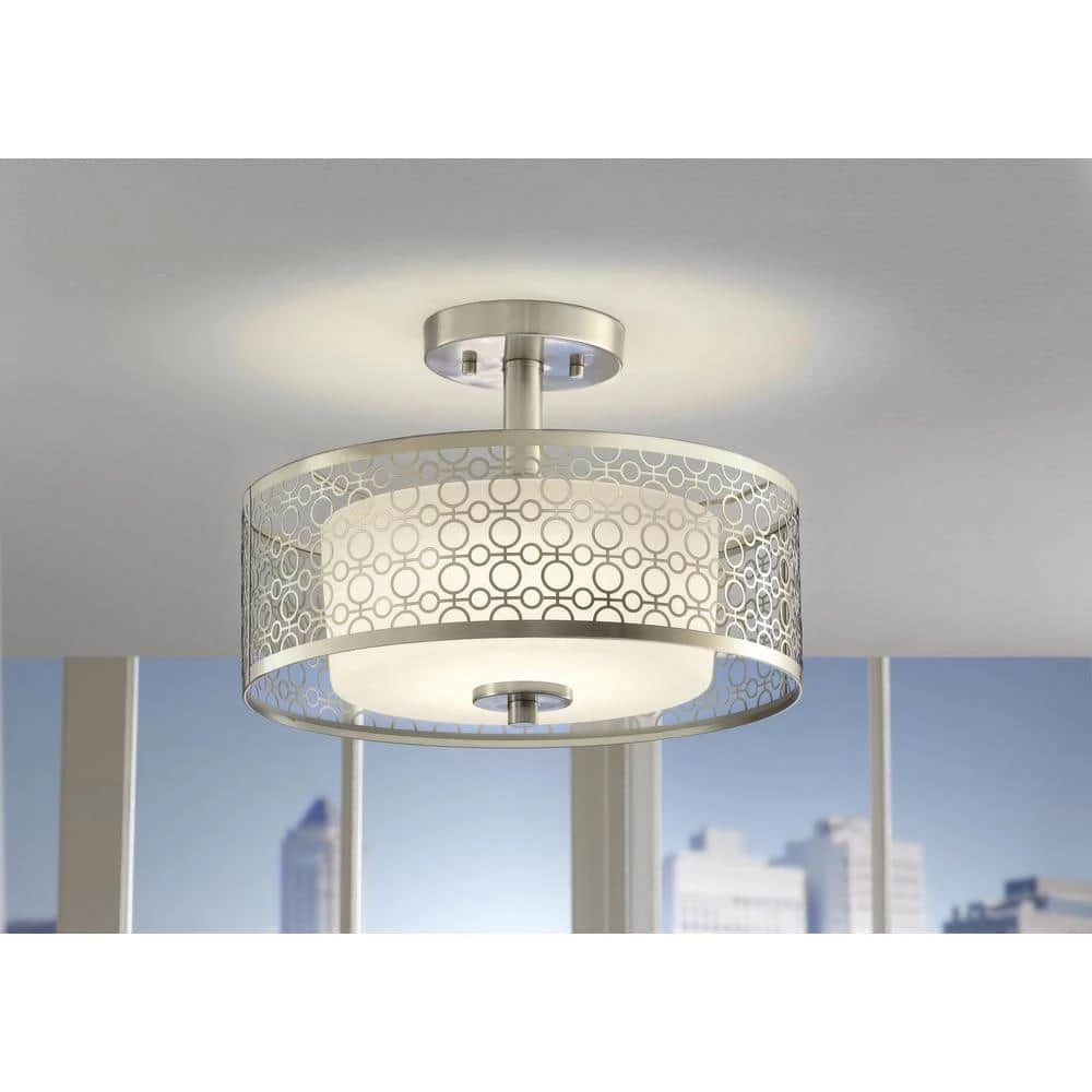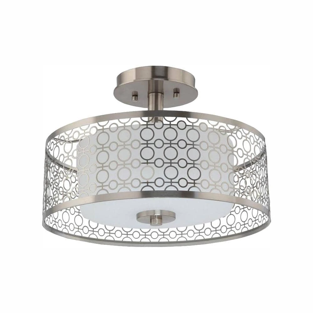 Go ahead. Mingle with your favorite home decor accents to find a place for this fun, flirty fixture. Subtle, parchment-like glass shades offer a discreet pattern and refreshing look when illuminated. A decorative metal frame that highlights alternating concentric, circular shapes surrounds all fixtures. The Brushed Nickel finish provides a nice, softly patterned diffused light for a variety of room settings.