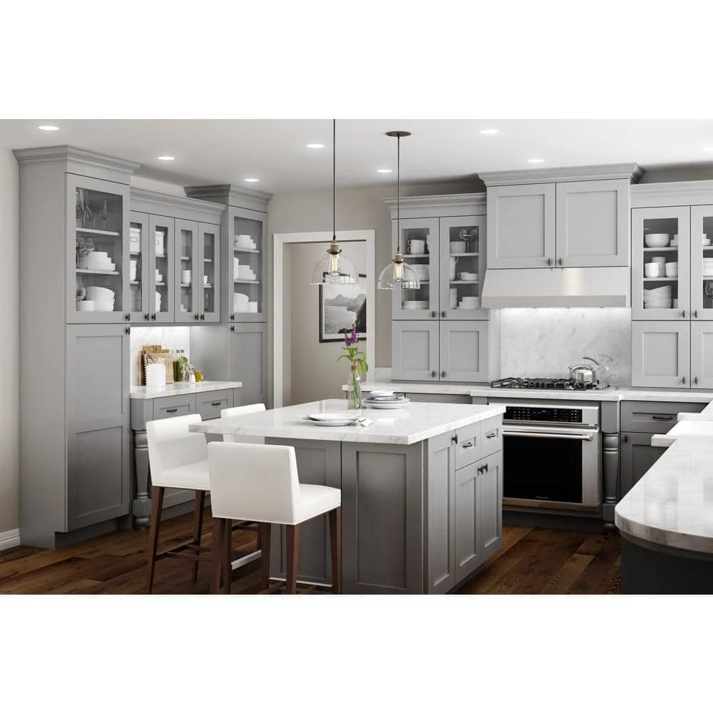 The Tremont Pearl Gray collection from Home Decorators Collection features a durable Gray painted finish which will create a light, breezy feel in any kitchen. Shaker-style doors and drawer fronts are crafted from solid MDF with a flat recessed center panel. Cabinets feature CARB compliant all-plywood construction with full-depth 3/4 in. thick adjustable shelves for added storage.