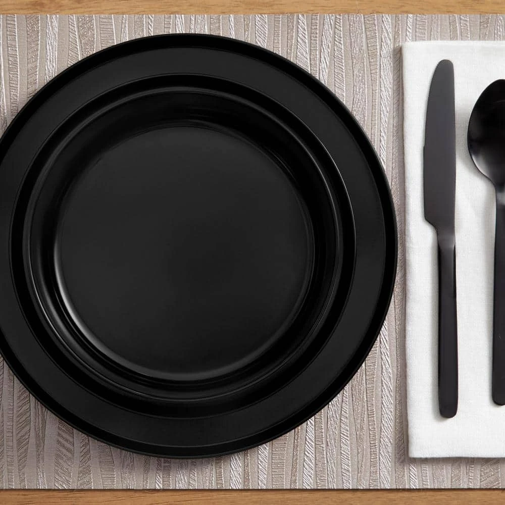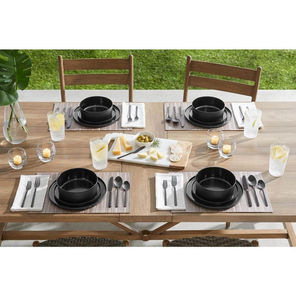 Set a sleek supper table with this 12pc Trenblay Melamine Dinnerware set in Charcoal Black from the Home Decorators Collection. The service for four includes a dinner plate, salad plate, and bowl for each person at the table. A neutral black color and bamboo-inspired details create a contemporary look to complement a range of serving pieces and can be easily paired with the natural beige pieces from the Trenblay Collection for added contrast. The sturdy melamine construction stands up to wear and tear and supports placement in the top rack of your dishwasher for simple cleaning between meals.