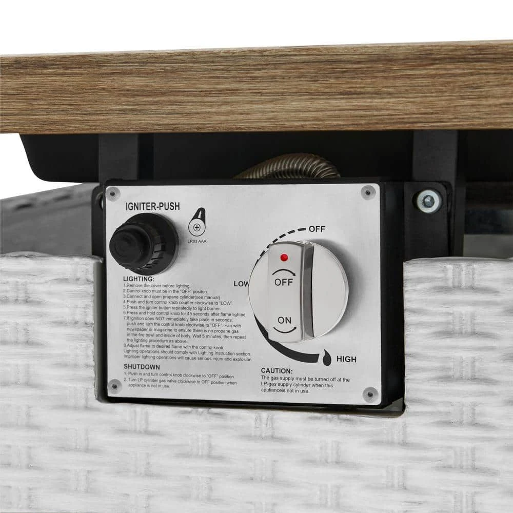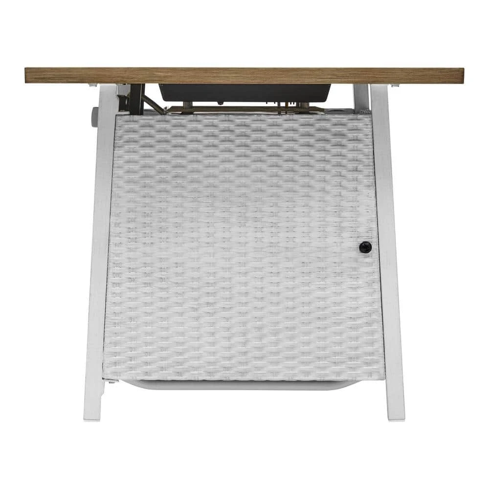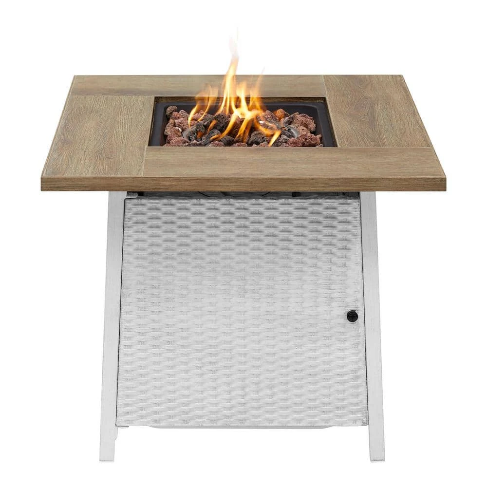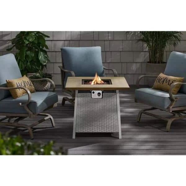 Featuring durable tile and metal construction with unique metal stamped wicker sides, this Tucson fire pit table creates a comfortable and stylish gathering space for outdoor entertainment. It is heat, scratch, weather, and rust-resistant so you can enjoy many seasons of worry-free lounging. The wood-look ceramic tile top creates a beautiful fire table that will fit a variety of decor styles. The fire pit matches the finish and styling of select patio furniture sets and tables from the Home Depot Mix and Match collection. Pair them together for a coordinated backyard design. With 7 ½ inches of mantel around the fire bowl, this 30 in. square gas fire pit offers plenty of tabletop space for dining and entertaining while gathered around the warm flames. Pairs well with light color metal, wicker, or wood patio furniture.