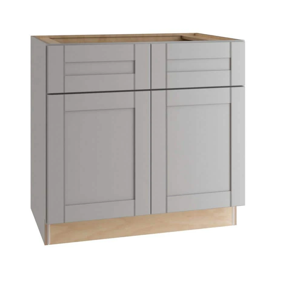 The Veiled Gray collection from Home Decorators Collection features a durable gray vinyl finish which will create a light, breezy feel in any kitchen. Shaker-style doors and drawer fronts are crafted from MDF with a flat recessed center panel. Cabinets feature CARB II compliant plywood construction with full-depth 3/4 in. thick adjustable shelves for added storage.