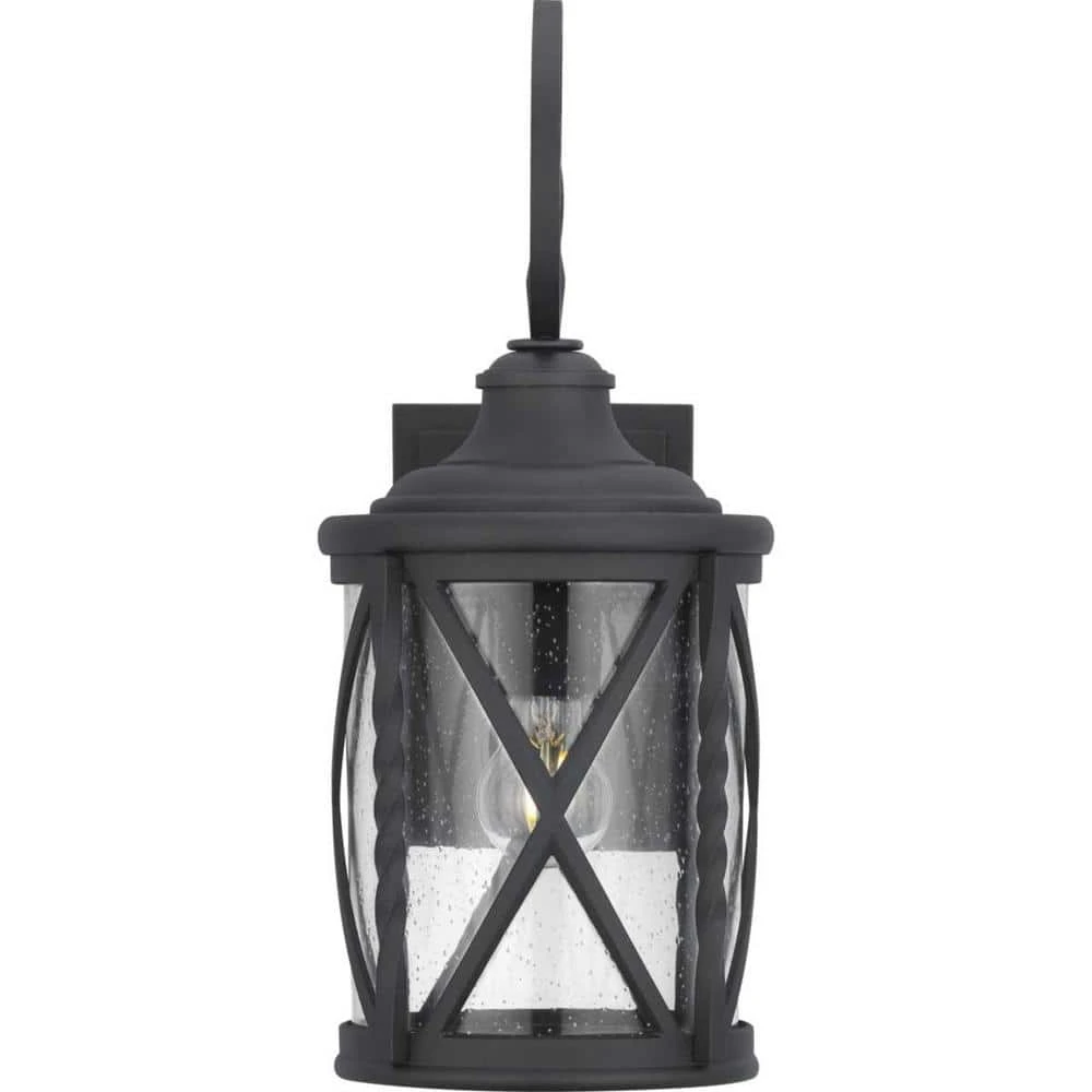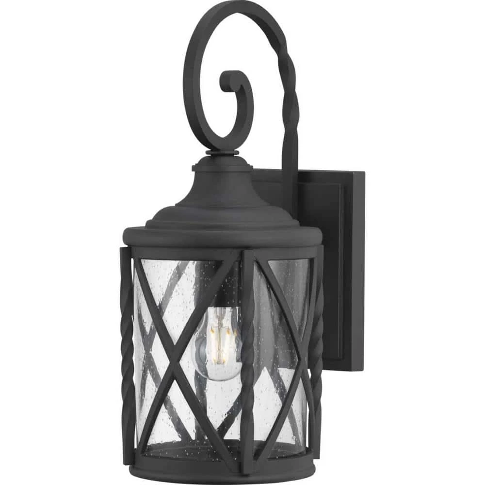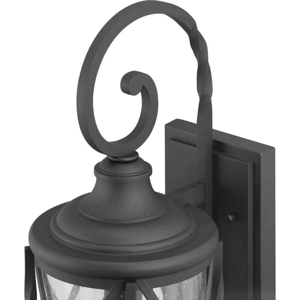 A one-light wall lantern featuring a Craftsman-inspired silhouette. The clear seeded glass and Black finish enhance a variety of home exteriors. The elongated frame provides additional visual interest with a combination of scrolling and linear details.