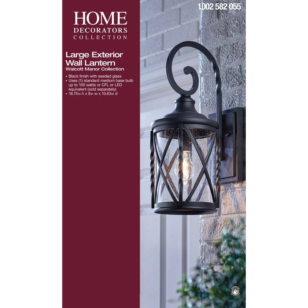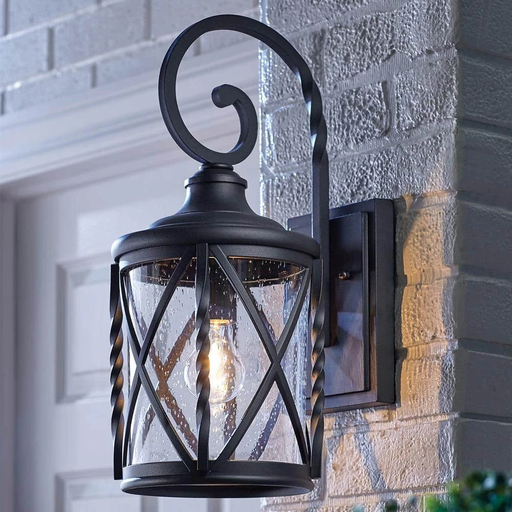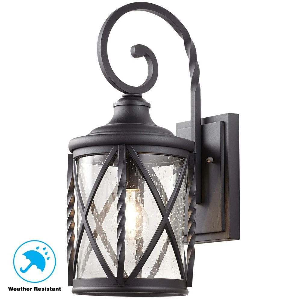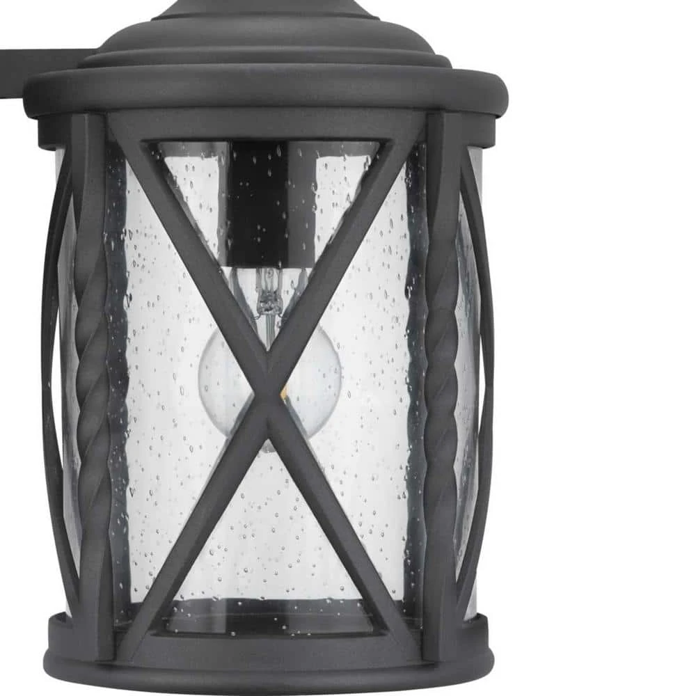 A one-light wall lantern featuring a Craftsman-inspired silhouette. The clear seeded glass and Black finish enhance a variety of home exteriors. The elongated frame provides additional visual interest with a combination of scrolling and linear details.