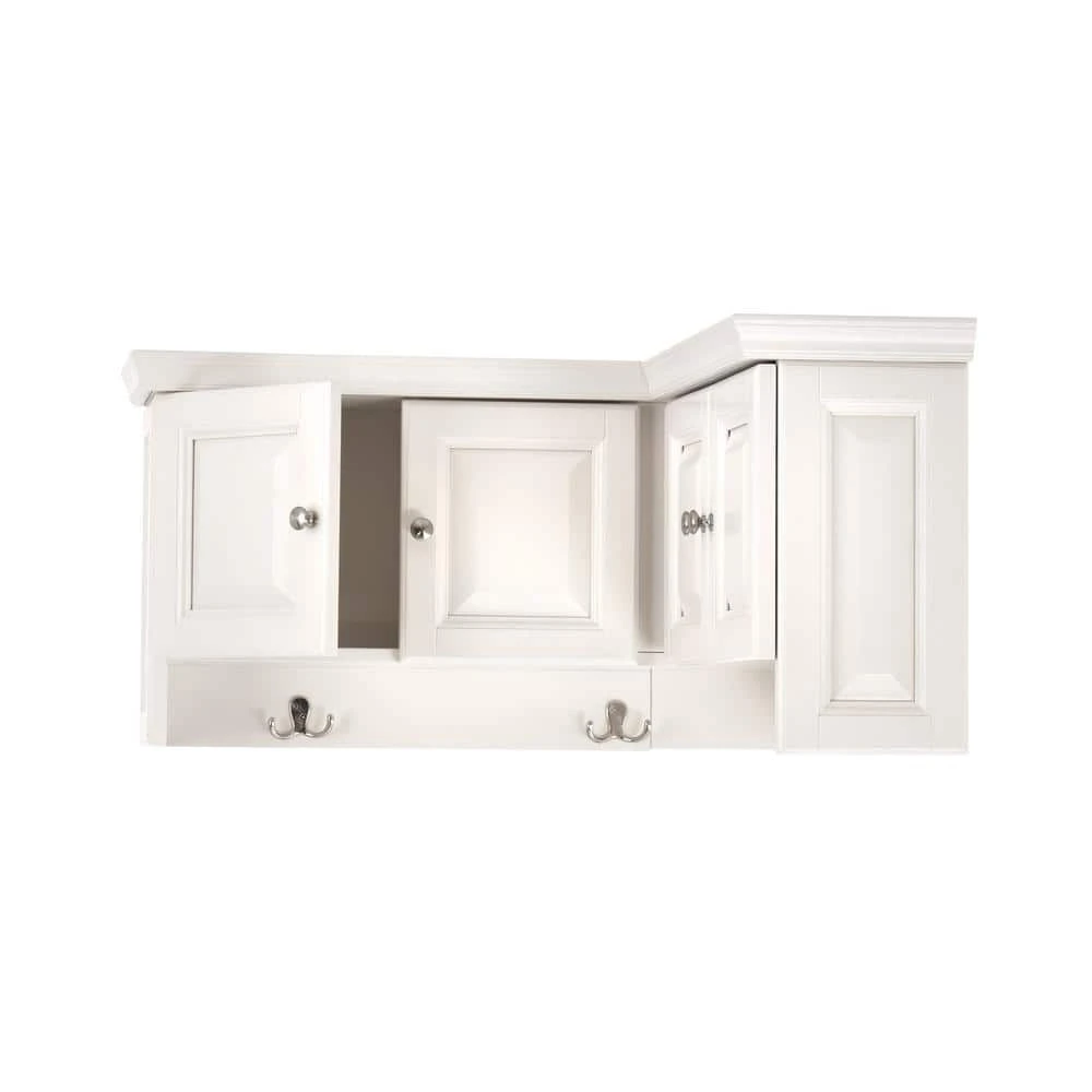 Move clutter up and away with the Walker Corner Wall Cabinet. Behind 2-pairs of doors, this lovely L-shaped wall storage unit offers ample cubby storage for linens, tools, cleaning supplies and other items. Additionally, hanging hooks are perfect for catching jackets, scarves, hats and bags, making this the perfect corner storage cabinet for your mudroom or laundry area.