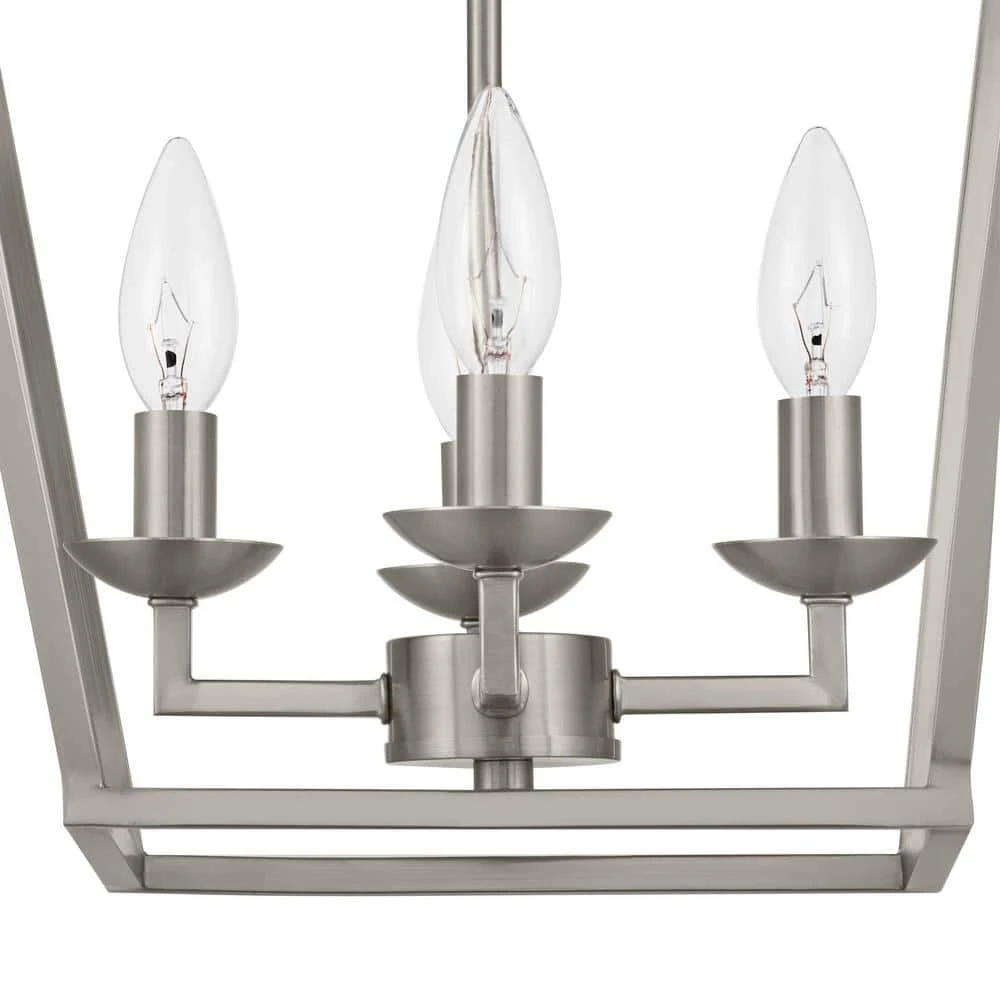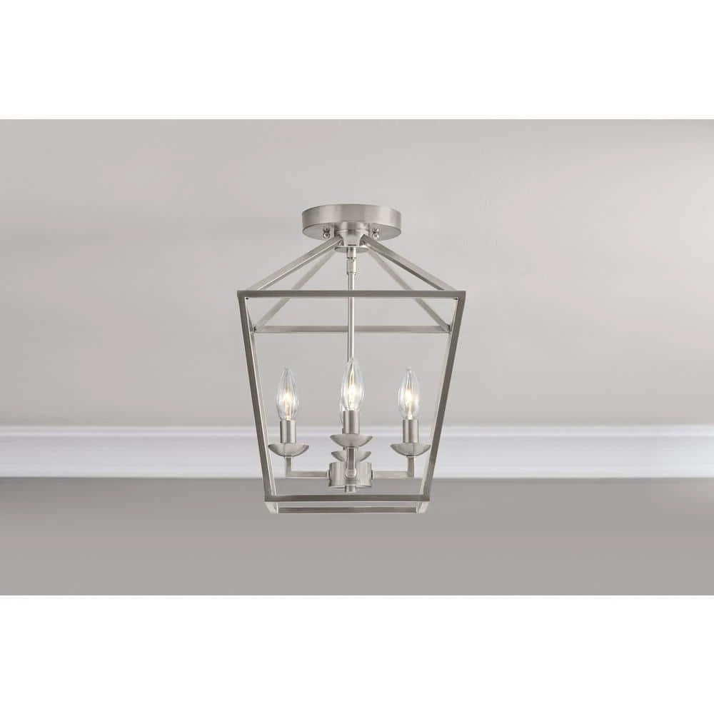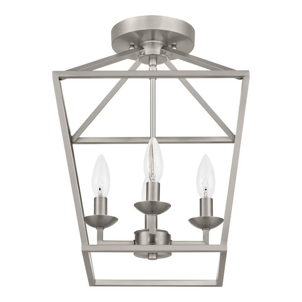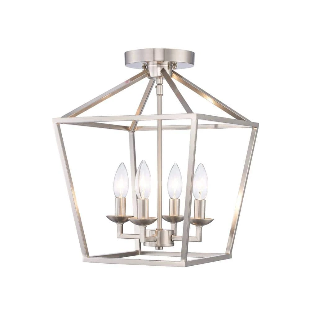 The Weyburn Collection exhibits farmhouse style indoor lighting with rustic, industrial appeal. Enhance your entryway, kitchen or dining room with the classic styling of this 4-light semi flush mounted ceiling light. Highlighted by a contemporary metal birdcage design and brushed nickel finish, this fixture adds a warm glow to a variety of indoor spaces. The open caged shade exposes the candelabra style bulbs for a classic look, perfect for providing ample task lighting in a variety of indoor applications. This semi flush fixture includes a matching round ceiling plate for mounting. Shop the Weyburn Collection for additional finish options and light counts.