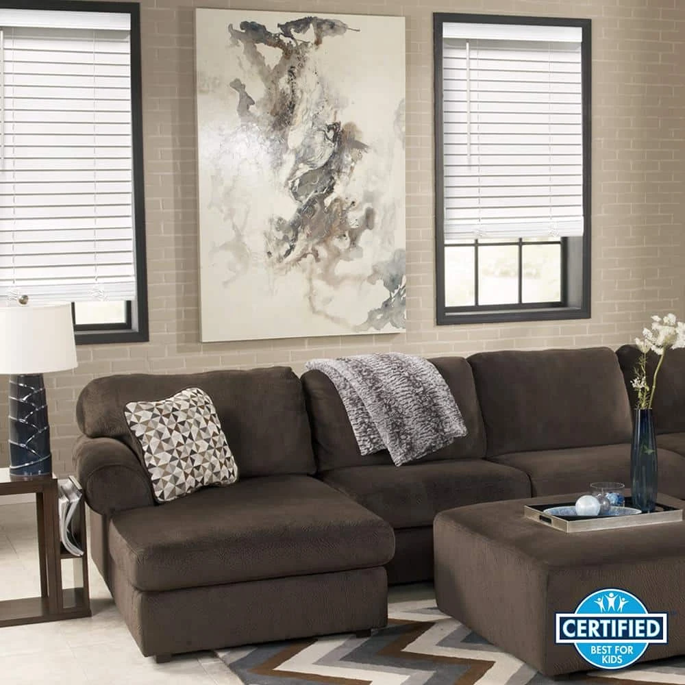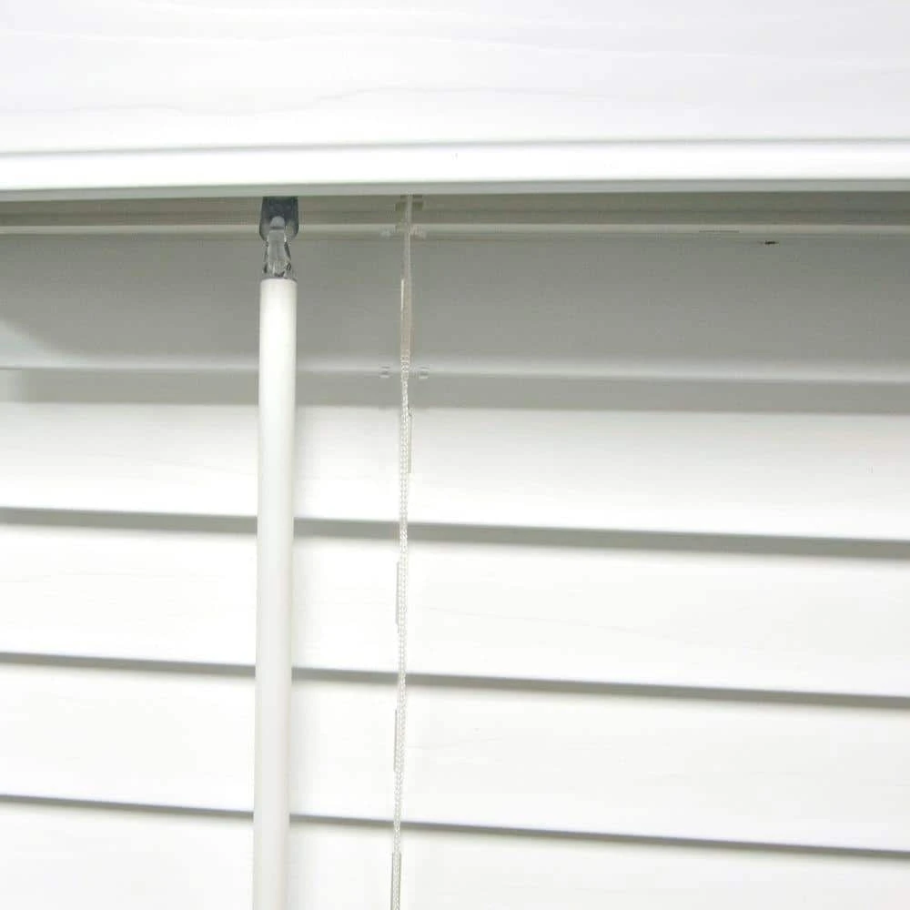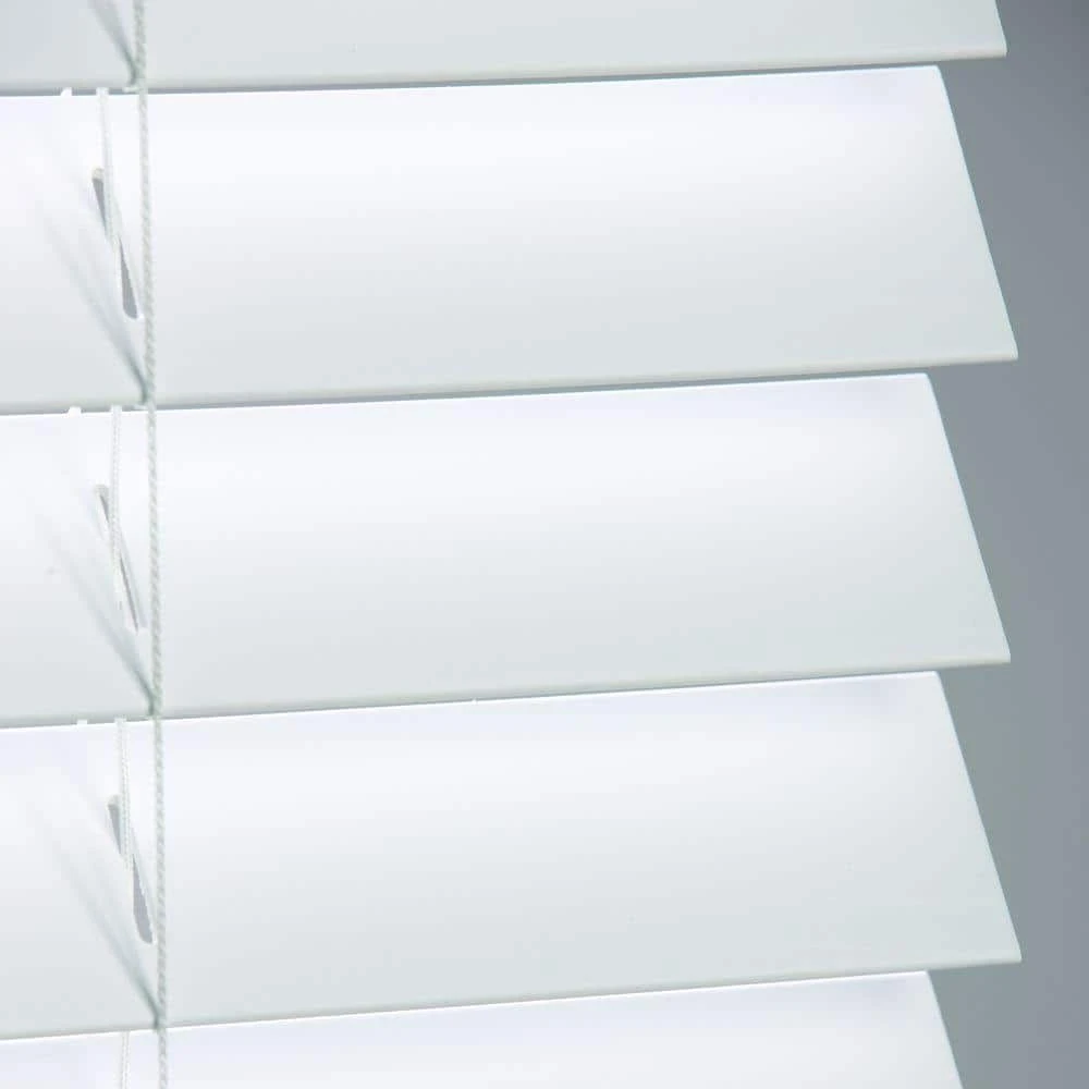 - White cordless room darkening faux wood blinds have 2 in. room darkening slats